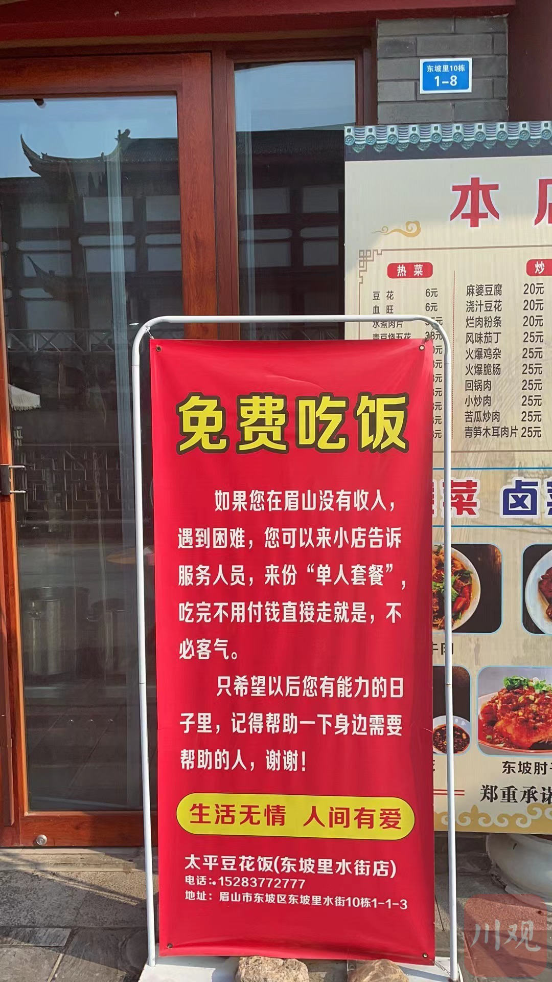 “如果你在眉山没有收入,遇到困难,可以来小店告诉服务人员来份‘单人套餐’,吃完不用付钱,直接走就是,不必客气。只希望以后你有能力时,记得帮助一下身边需要帮助的人。”近日,在眉山东坡里水街太平豆花饭饭店门口,一个“免费吃饭”的告示引起食客及行人的关注。