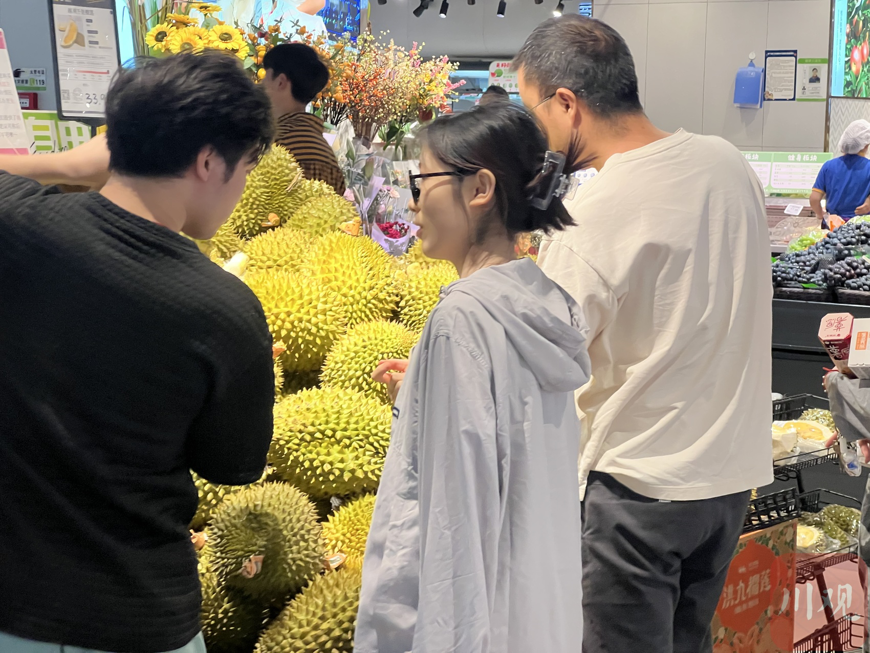 “不知道为什么,今年榴莲特别多,转个身就能看见卖榴莲的。”陈佳华说,她家附近一共有三家水果店,每个门店前都堆满了榴莲,基本上她购买的带壳金枕价格在29.8元/斤左右,最贵不超过32元/斤。较往年23—24元/斤的价格水平相比,贵了不少。