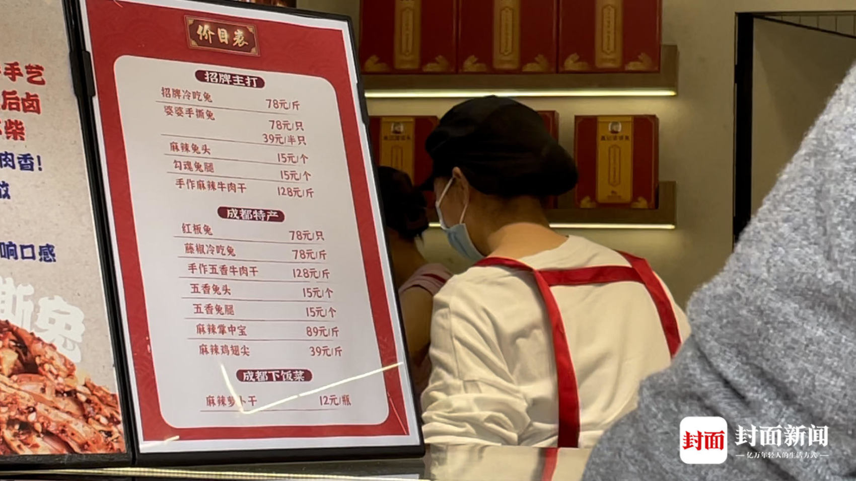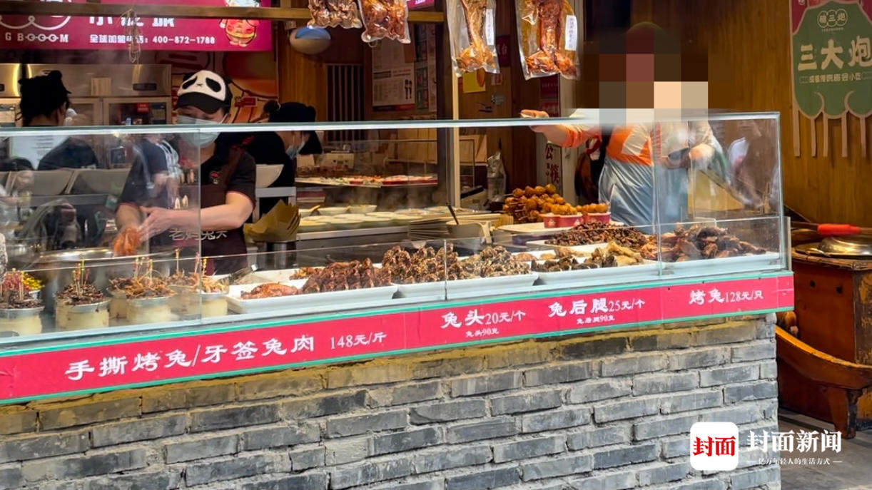 在市中心春熙路的一家老妈兔头店,一对年轻情侣在该店购买了5个兔头,两包冷吃兔以及一包冷吃牛肉,花费400余元。在看到兔头18元/个的价格后,女士直呼“好贵啊”,她表示,因为要去外地出差,“刚好遇到,就随便带一点。”