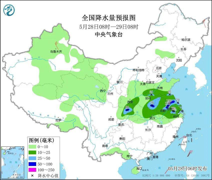 中央气象台5月28日06时继续发布暴雨蓝色预警:预计,5月28日08时至29日08时,陕西南部、四川东北部、重庆西北部、河南东部和南部、安徽西北部和中东部、江苏北部和中部、浙江西北部等地部分地区有大到暴雨,其中,安徽东部、江苏中部等地部分地区有大暴雨(100~150毫米)。上述部分地区伴有短时强降水(最大小时降雨量20~50毫米,局地可超过60毫米),局地有雷暴大风等强对流天气。