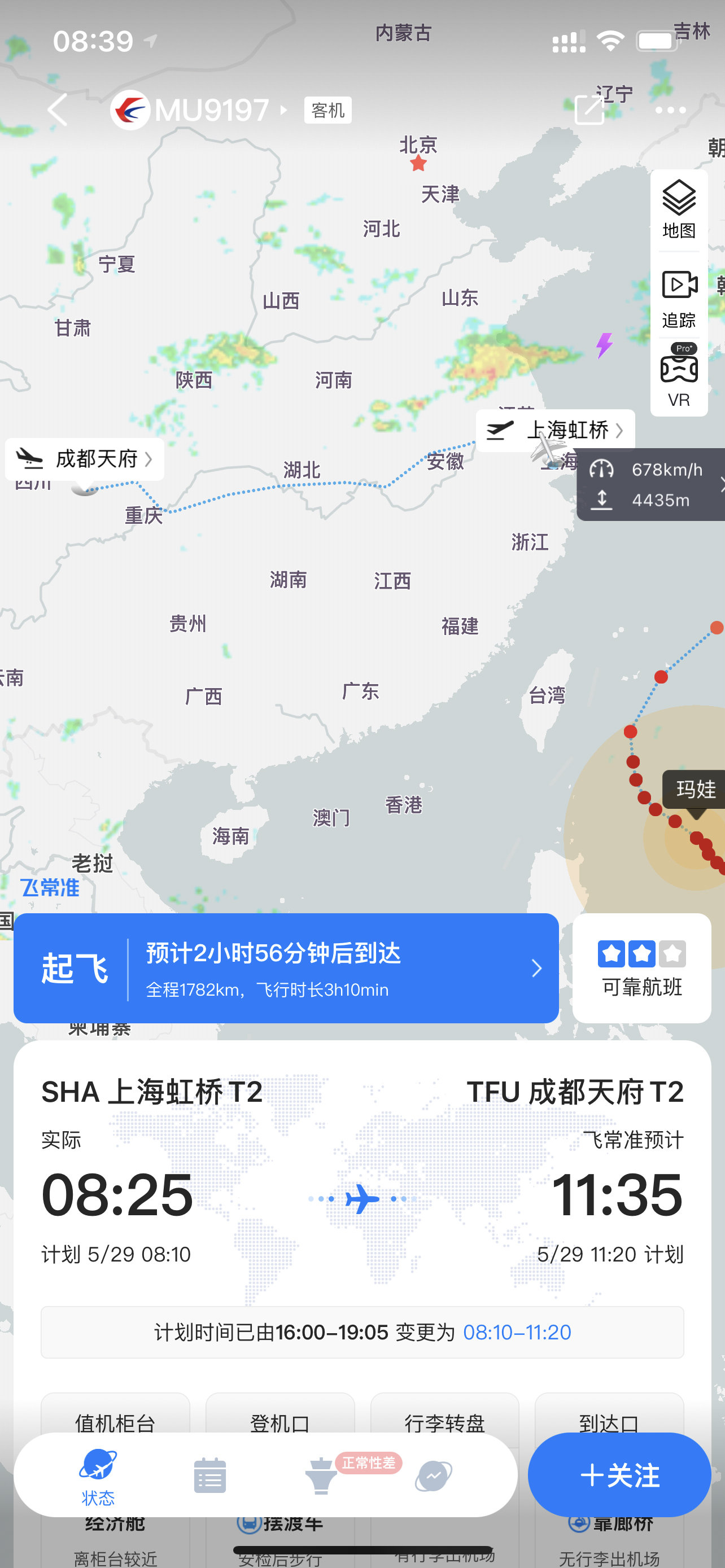 5月29日早上8时25分,由C919执飞的MU9197航班搭载135名乘客,从上海虹桥国际机场起飞,预计将于3小时后落地成都天府国际机场。