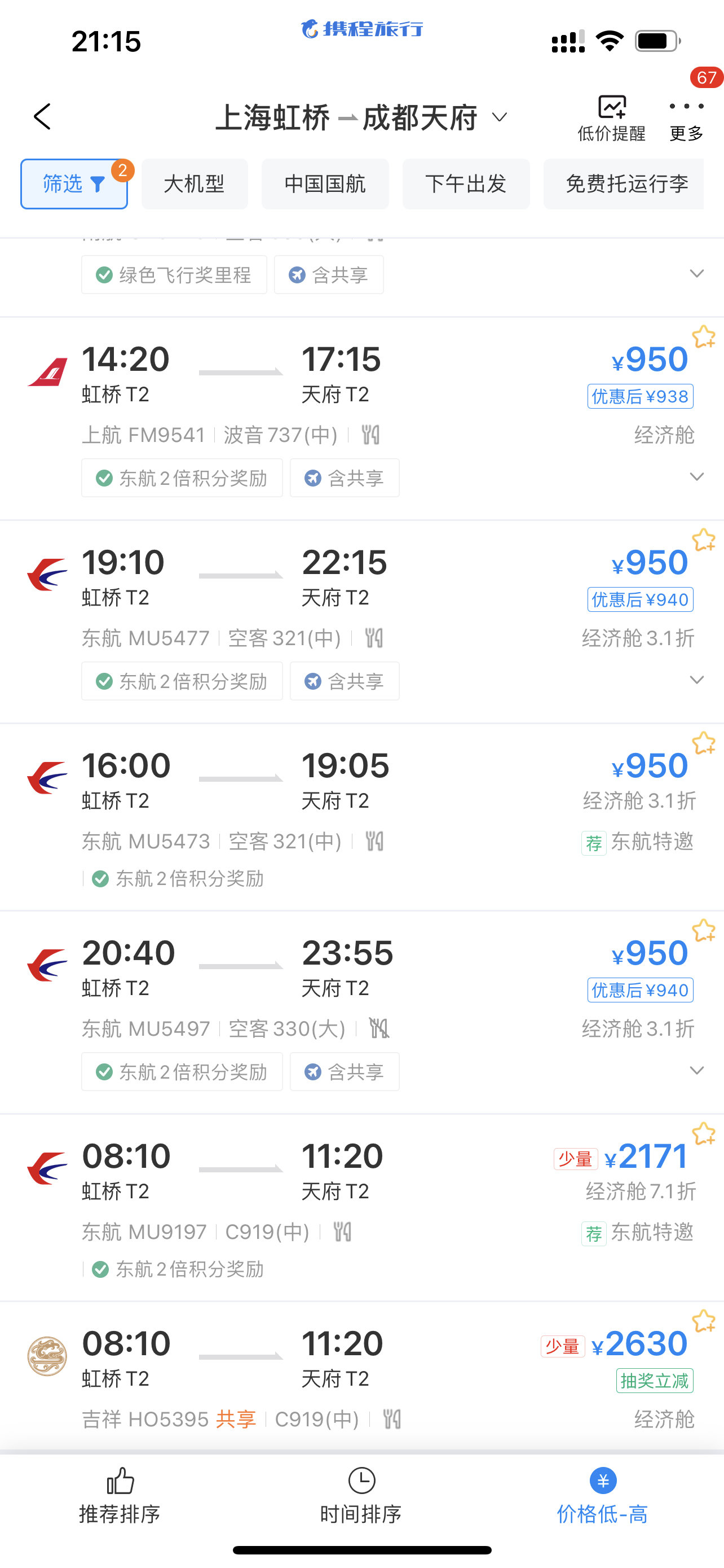 经查询售票平台,C919执飞的沪蓉航线5月29日至6月30日期间都有运行,每日往返各一班,其中上海虹桥飞成都天府航班号为MU9197,8时10分出发、11时20分到达;成都天府飞上海虹桥航班号为MU9198,12时30分出发、15时25分到达。