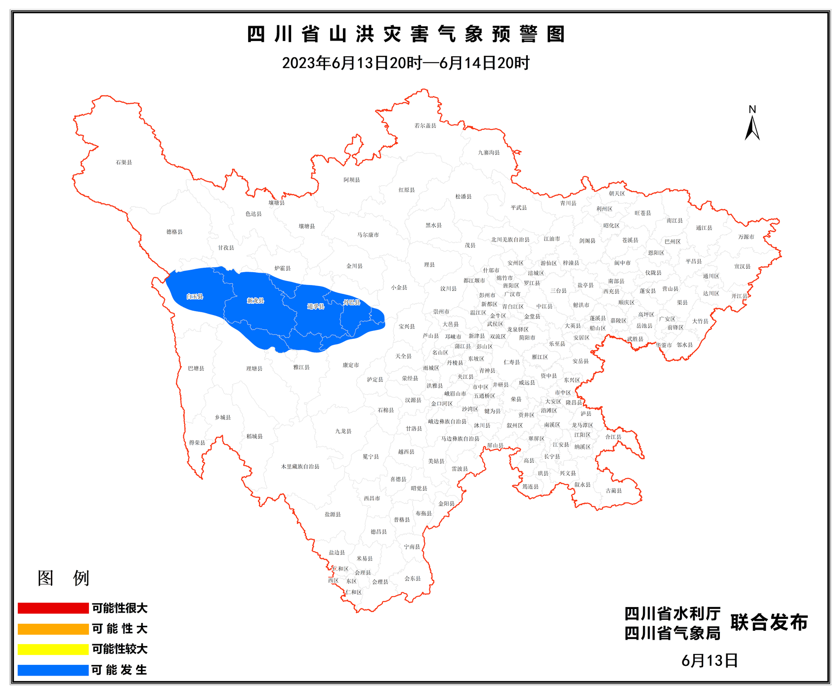 6月13日17时,四川省水利厅、四川省气象局联合发布山洪灾害蓝色预警。