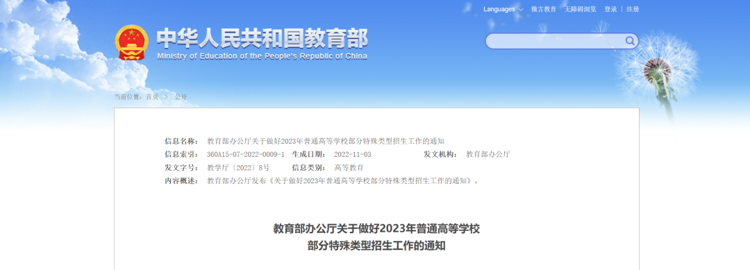 部分特殊类型招生工作的通知》