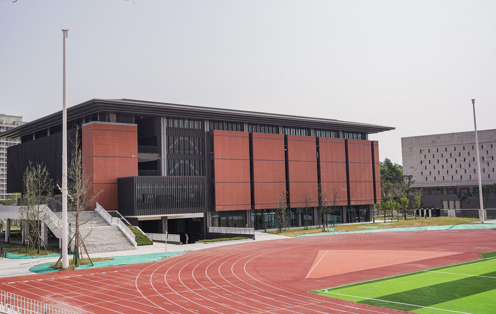 学校坐落于三岔湖畔,项目用地面积约18.17万平方米,总建筑面积约16.5万平方米,学校建筑包括交流中心、学生宿舍、食堂、小学教学楼、中学教学楼、综合楼、体育馆以及部分附属建筑物。