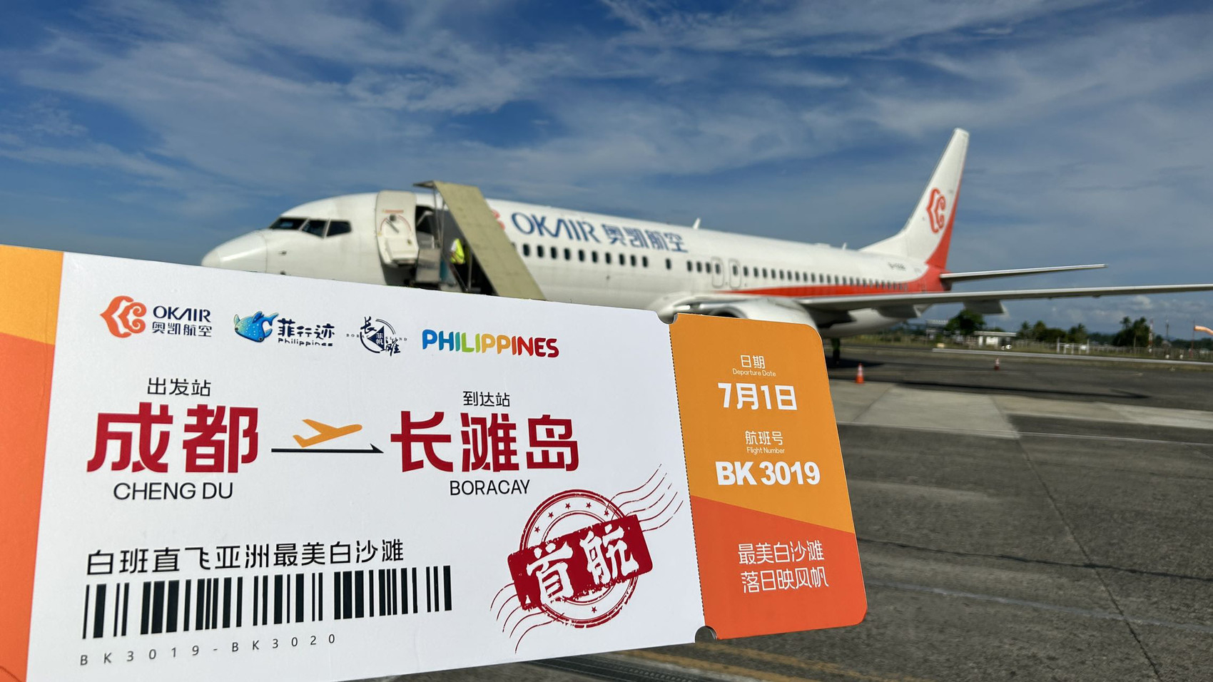 11时30分,在成都出入境边防检查站下达放行指令后,搭载了199名旅客的BK3019次航班从成都天府国际机场廊桥推出,4个小时后平安到达了长滩岛附近的菲律宾卡利博机场。