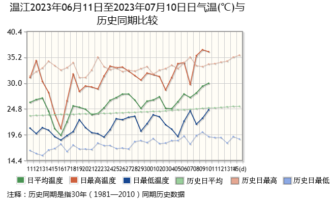 温江国家级气象站2023年6月11日至2023年7月10日气温与历史同期比较图