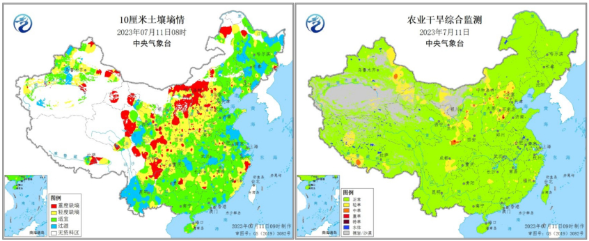 热力值拉升之下,中央气象台监测显示,7月11日,四川省内的土壤水分含量情况是这样子的(如下左图),省内部分区域达到农业轻旱(如下右图)。