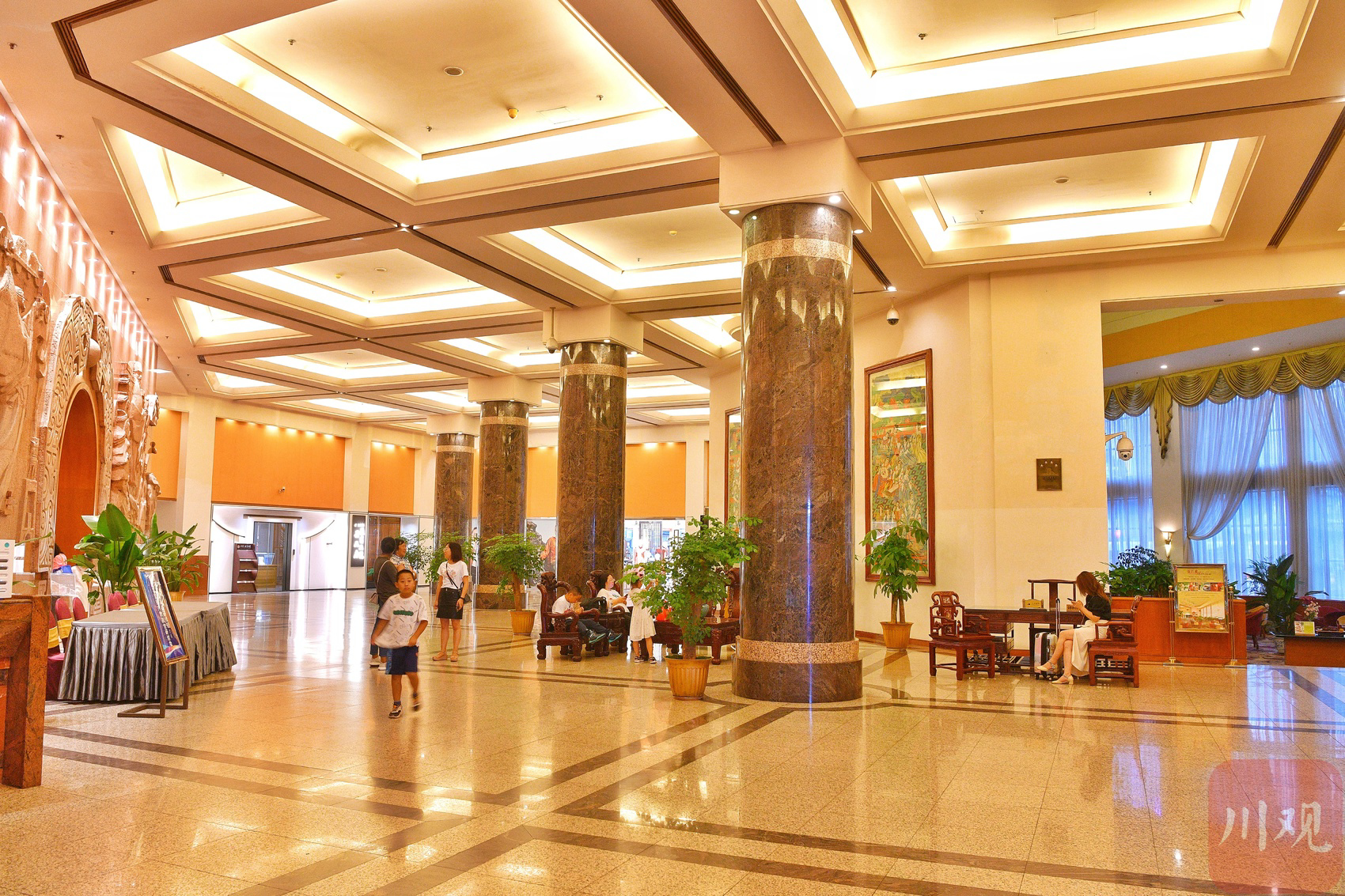 8月16日,记者探访了还在营业的成都银河王朝大酒店。酒店内的标志性大熊猫流水景观的停车场里只停留了一辆小车,酒店大堂内依然有外地游客,不过音乐吧台休息处没有服务员,店内丝绸服装店里也没顾客光顾,空荡荡的大厅显得有些冷清。时光荏苒,酒店大厅内当年由四川雕塑艺术院创作的“诸葛兴蜀”壁画依然传神,“三顾茅庐”“借东风”“舌战群儒”等场景把诸葛亮精彩的一生呈现得淋漓尽致。