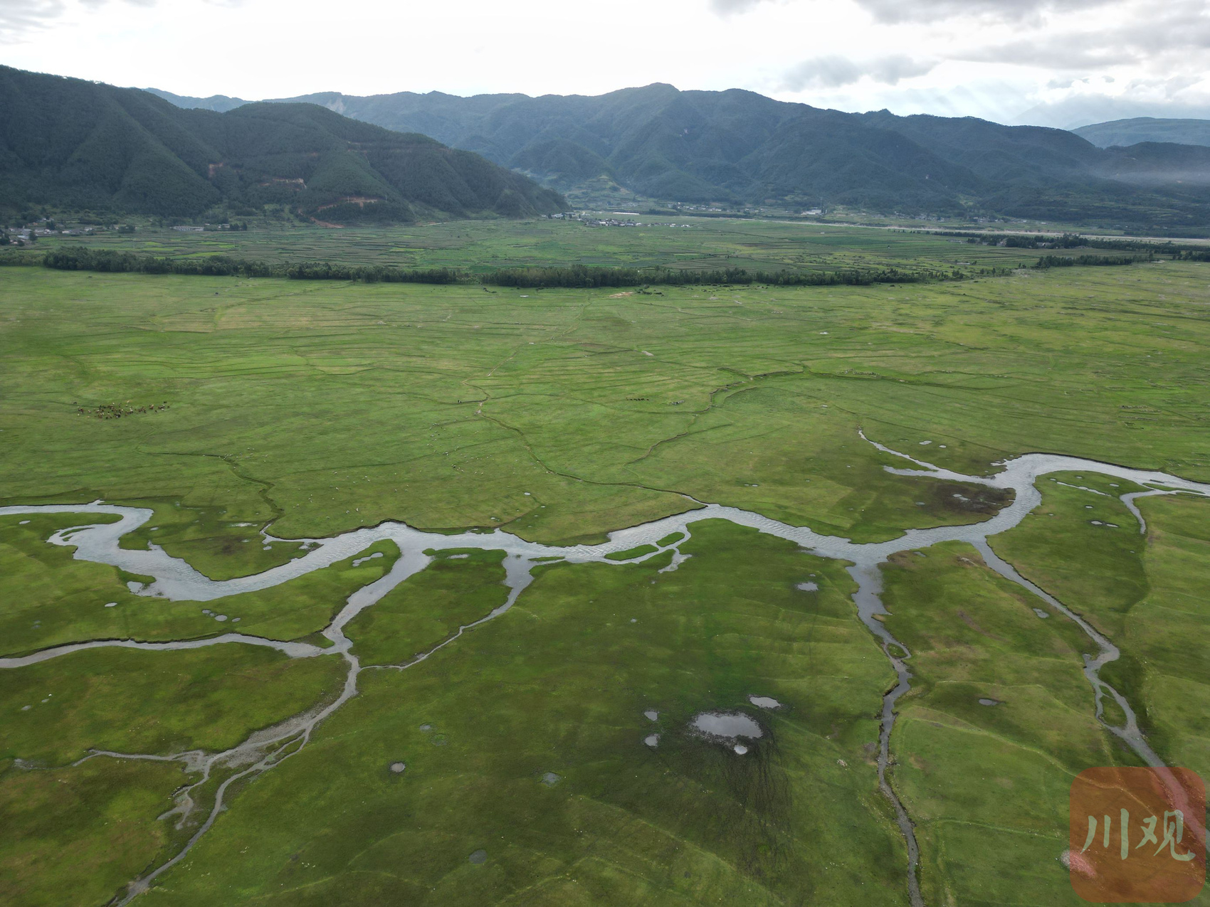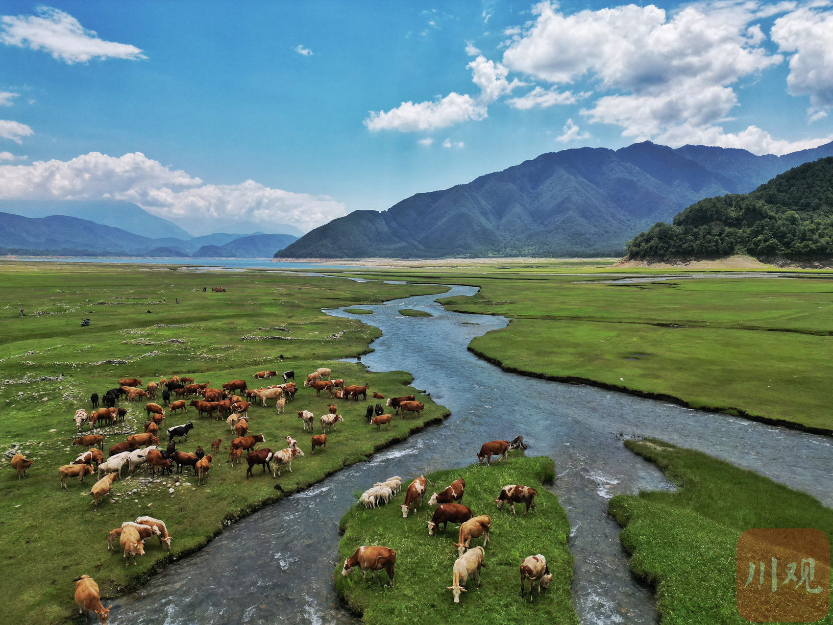 海拔2100米,宽阔的碧绿草地连接蓝色的湖面。操作无人机升空,用鹰眼视觉俯瞰,绝美的高原牧场风光更加直观。