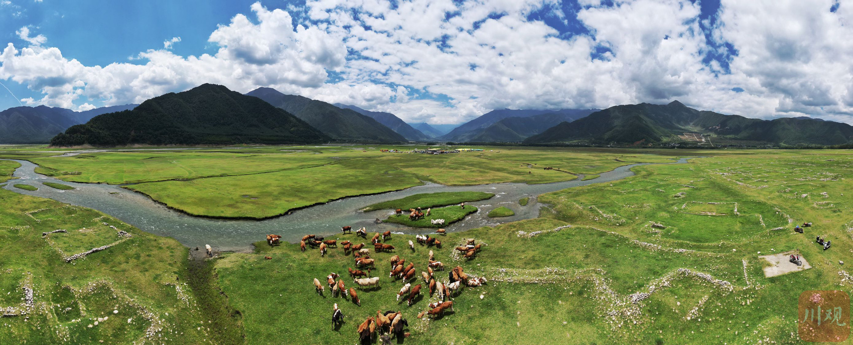 最高海拔超过4700米的阿嘎拉玛山下,有一块水草丰沛的湿地草场,蓝天白云下,成群的牛羊在绿色草地上悠闲觅食,小溪奔流,潺潺水声,给这幅绝美风光增添许多宁静和生动。