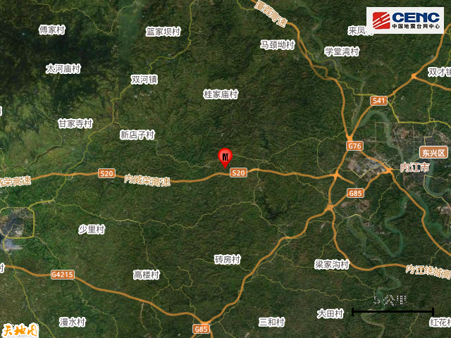周边县城:震中距市中区19公里、距东兴区20公里、距威远县20公里、距资中县20公里、距大安区26公里,距内江市18公里,距成都市142公里。