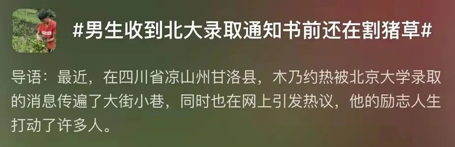 收到北大录取通知书前,他在地里帮家里干农活、割猪草的励志经历打动了无数网友,并迅速登上热搜。