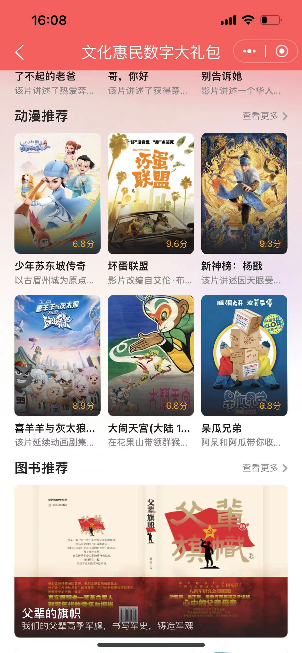 记者点击发现,目前,四川省“文化惠民数字大礼包”已汇集10000余部影视节目、20000余部数字阅读物及有声读物,包括《悬崖之上》《长津湖之水门桥》等传递正能量的热门视听内容,以及《三体》等热门优质读物。除了影视、图书资源,还有100余个文物、美术、书法、摄影线上展览,200余个体育运动微课堂、健身操等视频,让观众实现足不出户就能看展览、运动。
