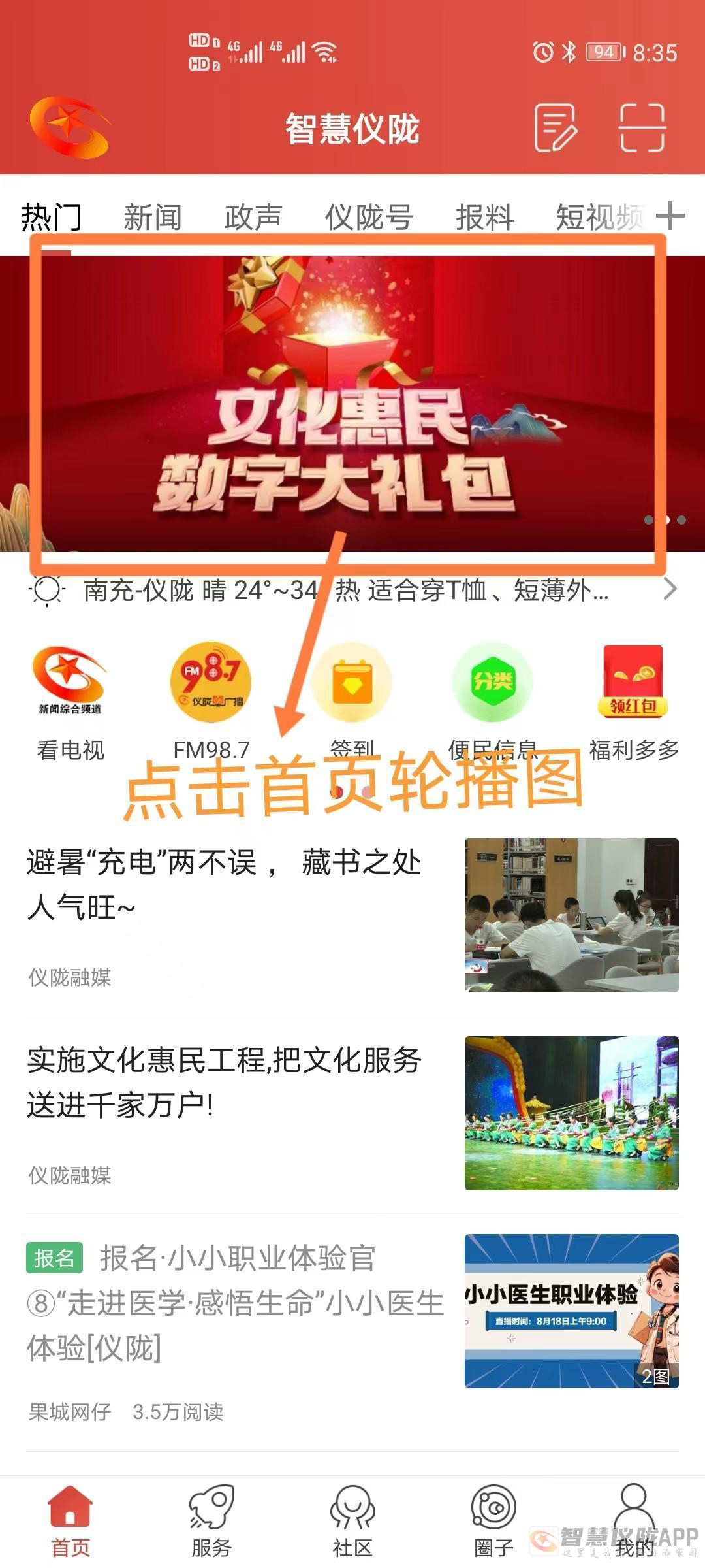 打开“智慧仪陇”APP,轻触首页”文化惠民数字大礼包“轮播图,不用看广告、不用充值VIP会员,上万部热门影视作品、数字阅读物及有声读物,上百个线上VR展览和体育微课堂就能免费观看和使用。