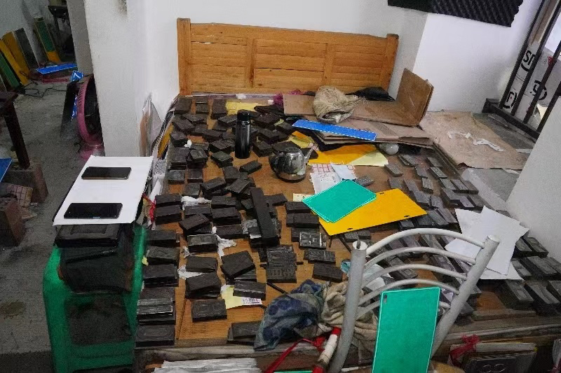 民警现场查获用于制假的电脑、打印机、激光刻章机、塑封机、扫描仪等各类设备21件,印章章皮2万余个,假车牌、假证件、印章成品300余件,半成品及材料6900余件。