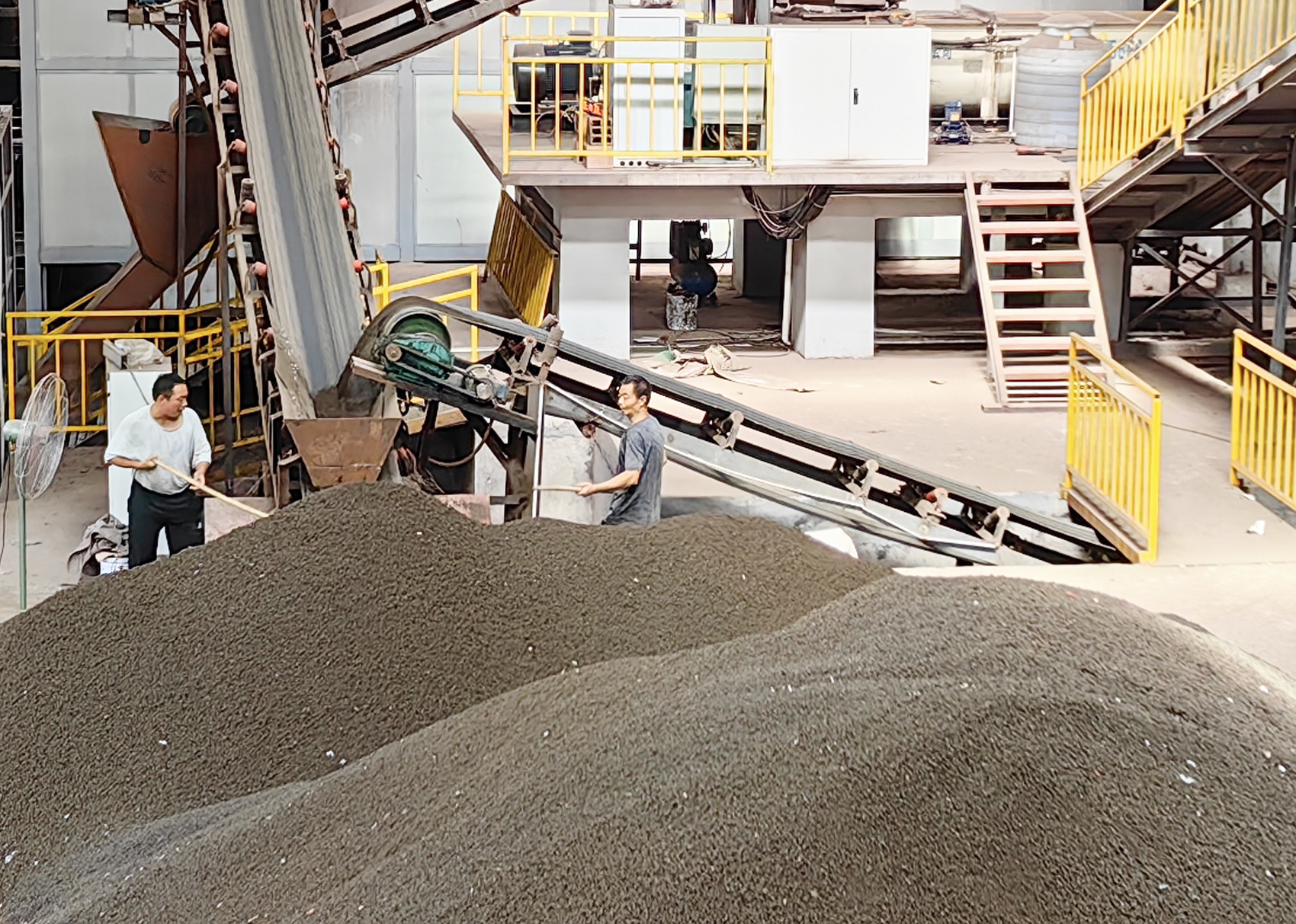 工作人员正在对烘干的污泥进行处理。