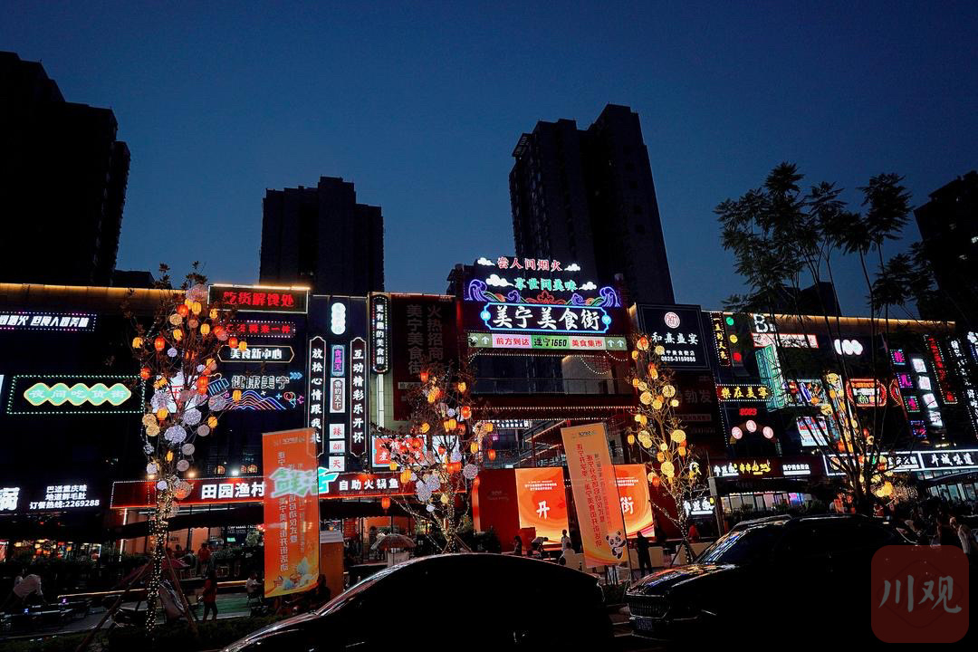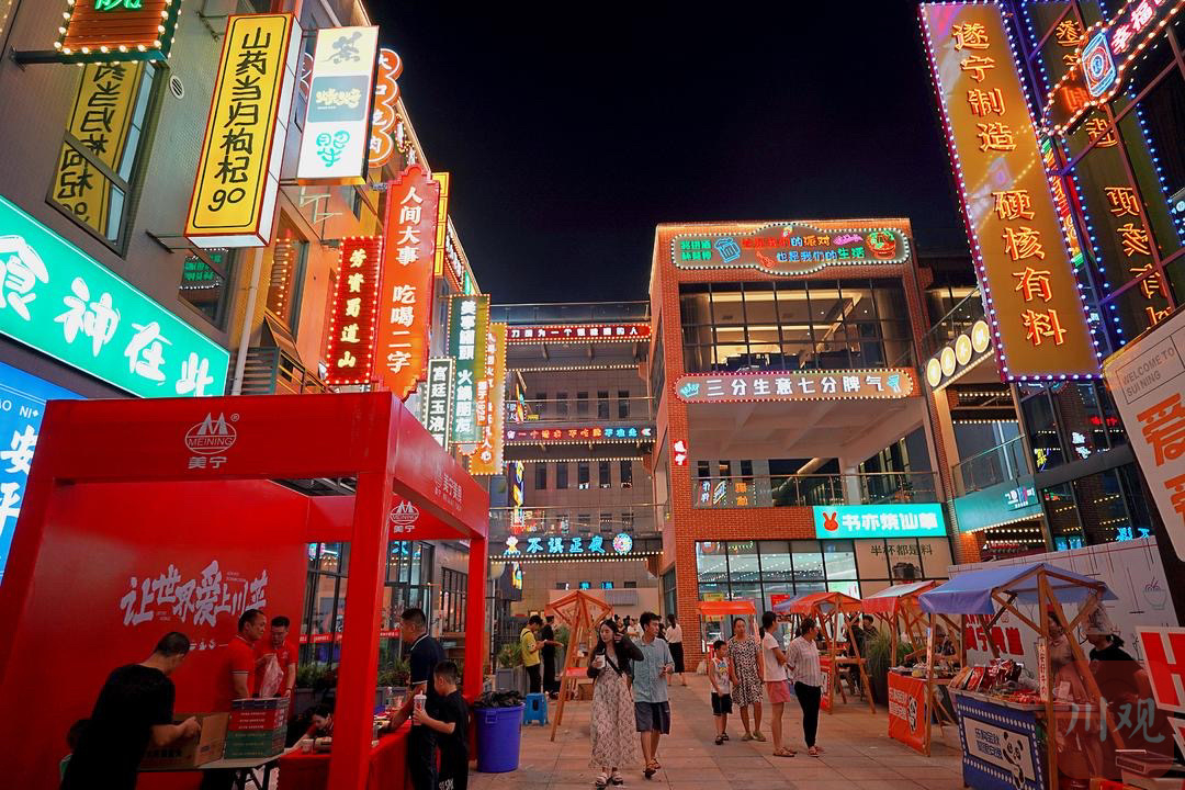 霓虹灯光、夜景广告牌……走进美食街,不仅能感受到港式风情街景,还可以品特色美食、看精彩演出、逛大学生集市摊位创业区。8月31日晚,第二届中国(四川)国际熊猫消费节遂宁分会场暨遂宁开学季启动·美宁美食街开街仪式在遂宁市河东新区任家渡商圈举行。
