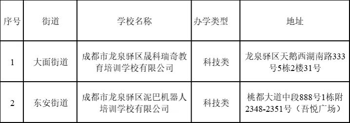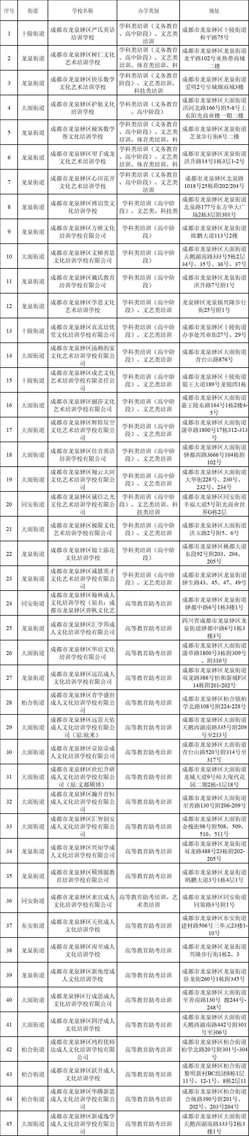 9月5日,记者从成都市龙泉驿区教育局获悉,为深入贯彻落实“双减”政策,深化校外培训机构治理,切实维护广大学生和家长的合法权益,龙泉驿区“双减”办将区教育局、龙泉驿区新经济和科技局、龙泉驿区文体旅局等部门最新审核通过的177所校外培训机构“白名单”向社会公布(艺术类130所、学科类45所、科技类2所)。“白名单”具体内容如下: