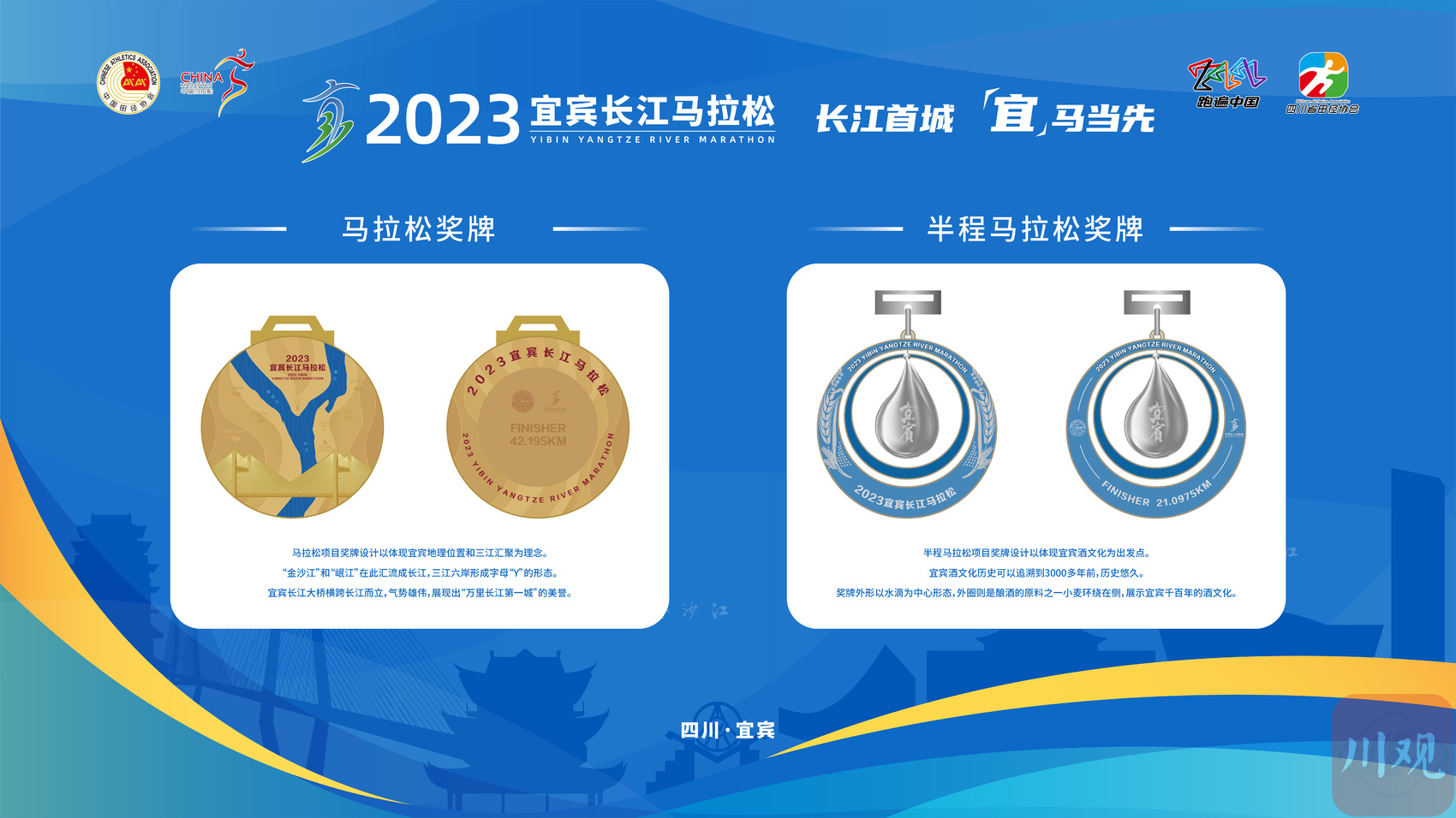马拉松的奖牌以体现宜宾地理位置和三江汇聚为理念。“金沙江”和“岷江”在此汇流成长江,三江六岸形成字母“Y”的形态;半程马拉松项目奖牌设计以宜宾酒文化为灵感,奖牌外形以水滴为中心形态,外圈则用酿酒的原料,小麦环绕四周,展示宜宾千百年的酒文化;家庭跑项目奖牌设计元素是宜宾特色小吃宜宾燃面,突出宜宾的美食文化和张扬乐观的生活态度;欢乐跑项目奖牌以宜宾特色地标为特色——万里长江第一楼夹镜楼飞檐翘角、气势巍峨,与三江口的长江明珠交相辉映,传统阁楼与新星之珠,从传承到创新,这是宜宾城城市发展最具代表性的地标。