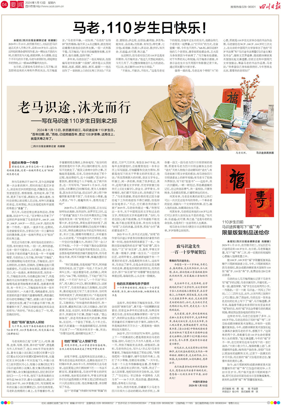 一大早,记者就带着刚刚出版的《四川日报》赶往位于城西的马老家中。今天的《四川日报》用一个整版报道了马老迎来110岁的盛事,并向马老致以最真诚的祝福。