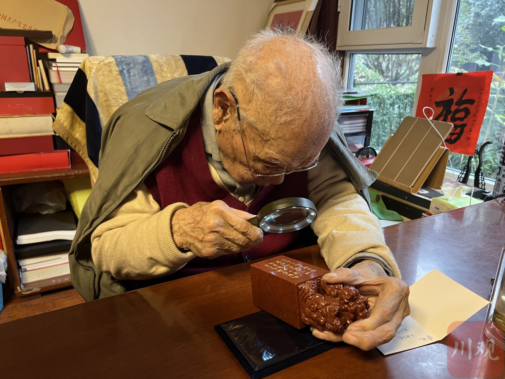 马老回到家,小憩了一会儿之后,起身到书房开始研究四川人民出版社送来的一方印“守朴归真”。整方印,采用了是九叠篆宋代官印形式,马老拿着放大镜,带着记者一个字一个字地辨认,看了半天,他笑着说:“这个篆得太多了,一层一层的,还差点认不出来。”再看了一会儿,马老说:“嗯,看出来了。这个归字,还是繁体的歸。”