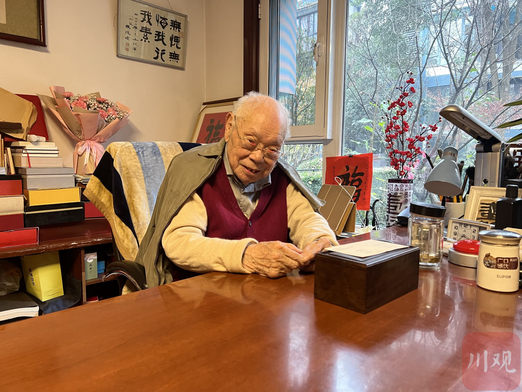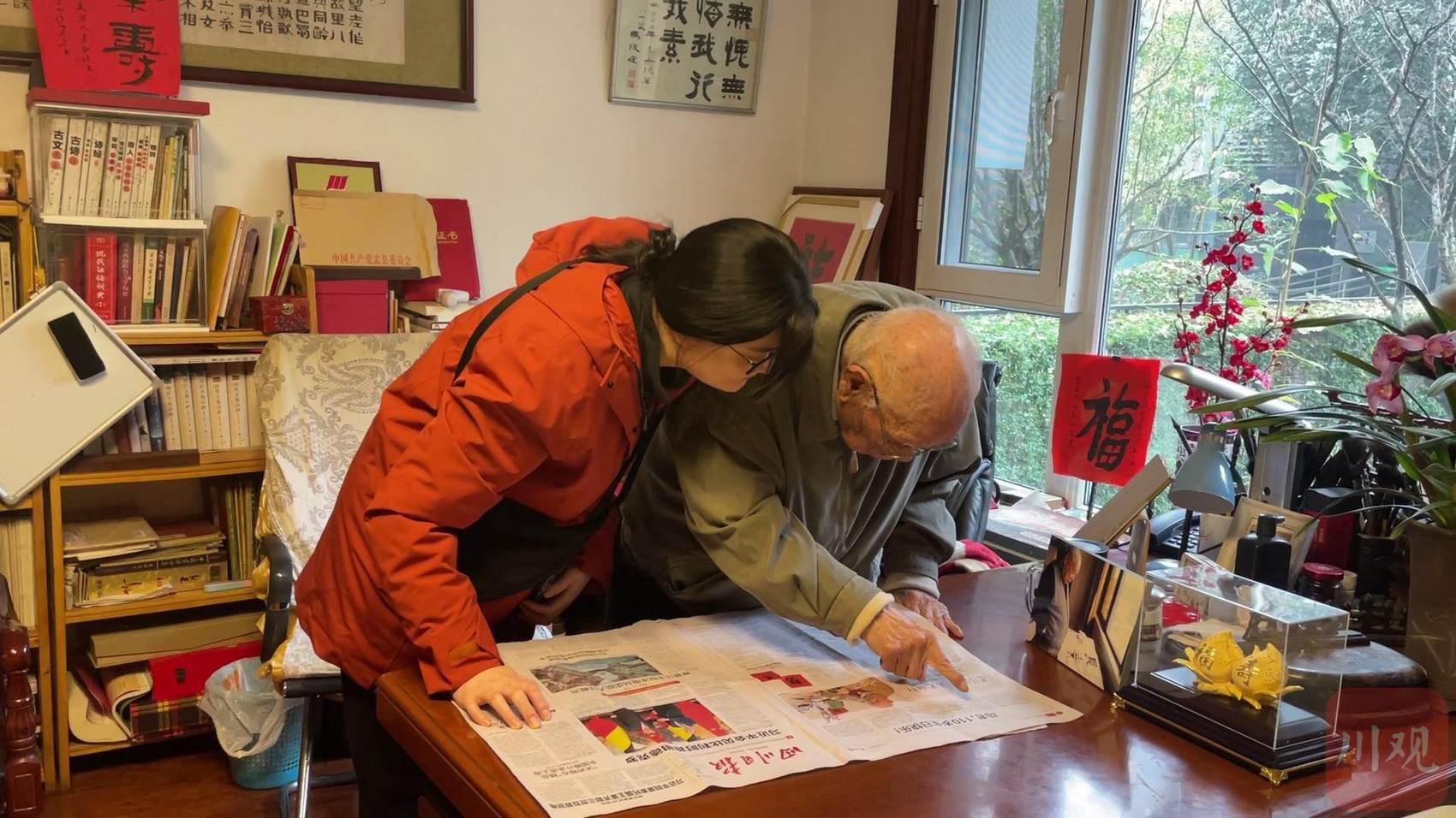 当记者将当天的《四川日报》送到马老手中,马老激动地打开报纸,一眼就看到了最大的标题《马老,110岁生日快乐》,当即乐开了花。拿起放大镜,一排一排地仔细阅读,开心地说道:“感谢四川日报,还给我整了这么大一版啊!做得好!写得好!”在记者未到之前,马老与好友们就已经在网上阅读了这篇稿子,都点赞真情实感,十分动人。记者带去的《四川日报》,马老亲自留下一份,郑重地打开放在书桌上,多余的几份被好友们一抢而空,大家都说一定要留下这份珍贵的记忆。