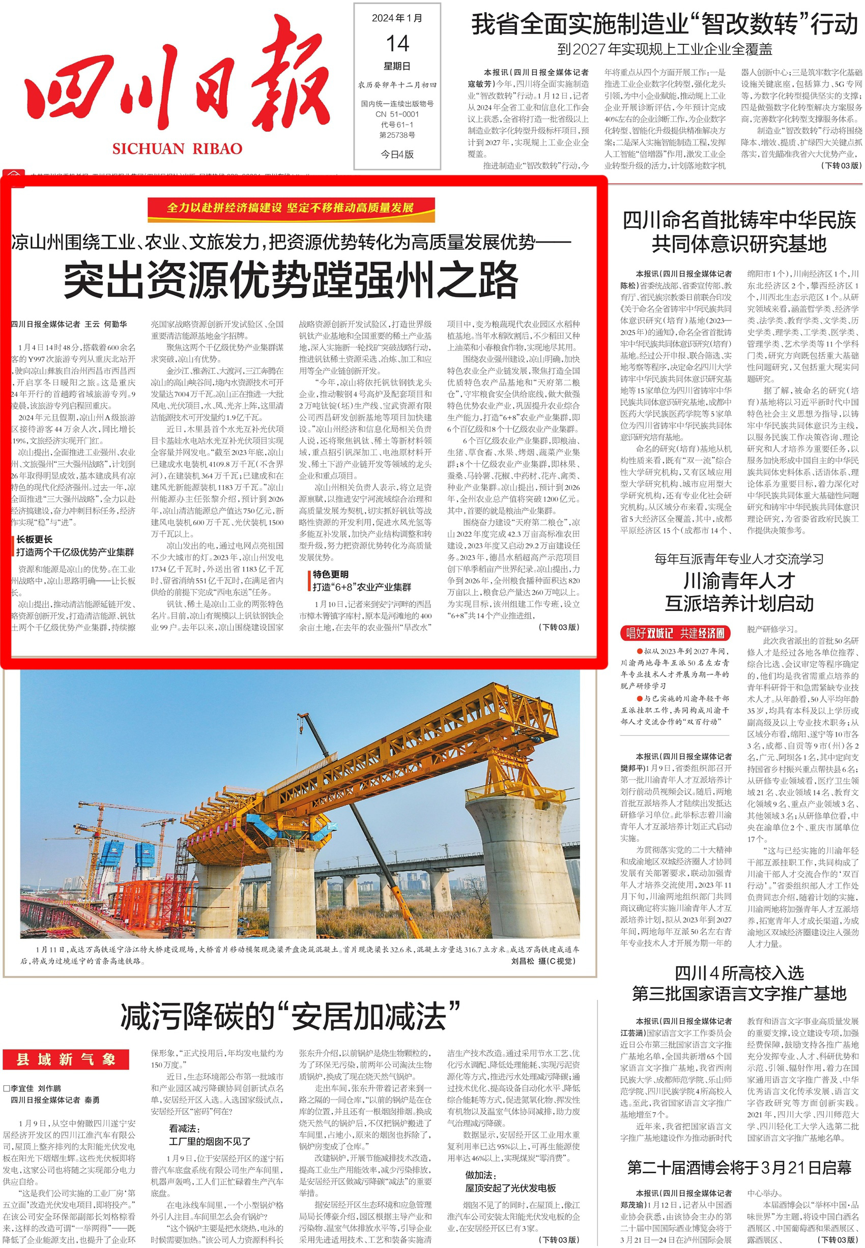 1月14日,四川日报在一版头条显著位置刊发文章《凉山州围绕工业、农业、文旅发力,把资源优势转化为高质量发展优势——突出资源优势蹚强州之路》,聚焦凉山州全面推进工业强州、农业强州、文旅强州“三大强州战略”,全力以赴拼经济搞建设,奋力冲刺目标任务。计划到2026年,凉山“三大强州战略”将取得明显成效,基本建成具有凉山特色的现代化经济强州。