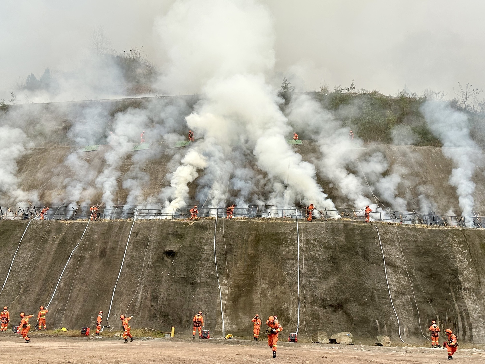 然而,南线悬崖中部发生“复燃”,工业园区安全再受威胁。紧急时刻,以火灭火战术立即投用。各救援队伍就近撤离,火场全线喷水增湿,随后,四川省森林消防总队派出一支突击小队沿火场南线山脚,向悬崖上方实施以火攻火。