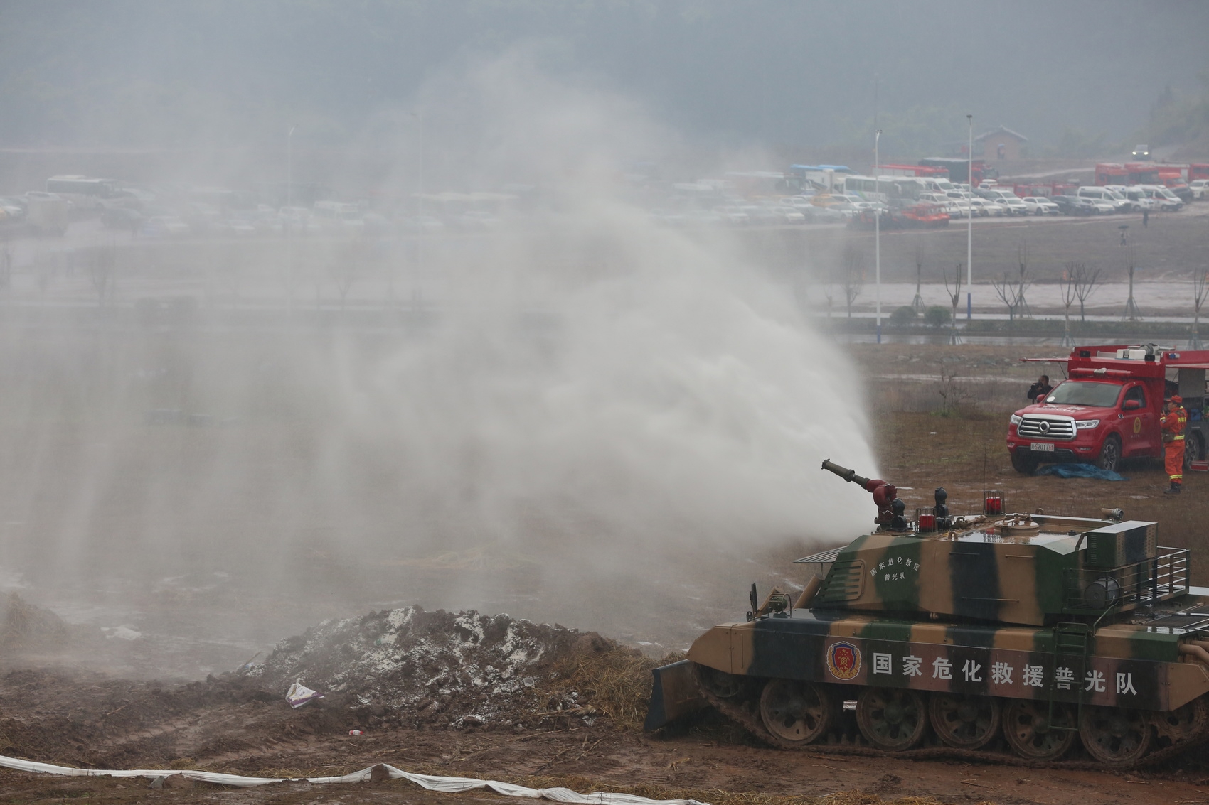 演练中模拟火灾引发山体局部滑坡和坍塌,通信道路上出现明火。消防坦克应势出动,液压推铲清障开路,全身的喷淋装置打灭沿路火苗,边灭火边清障。