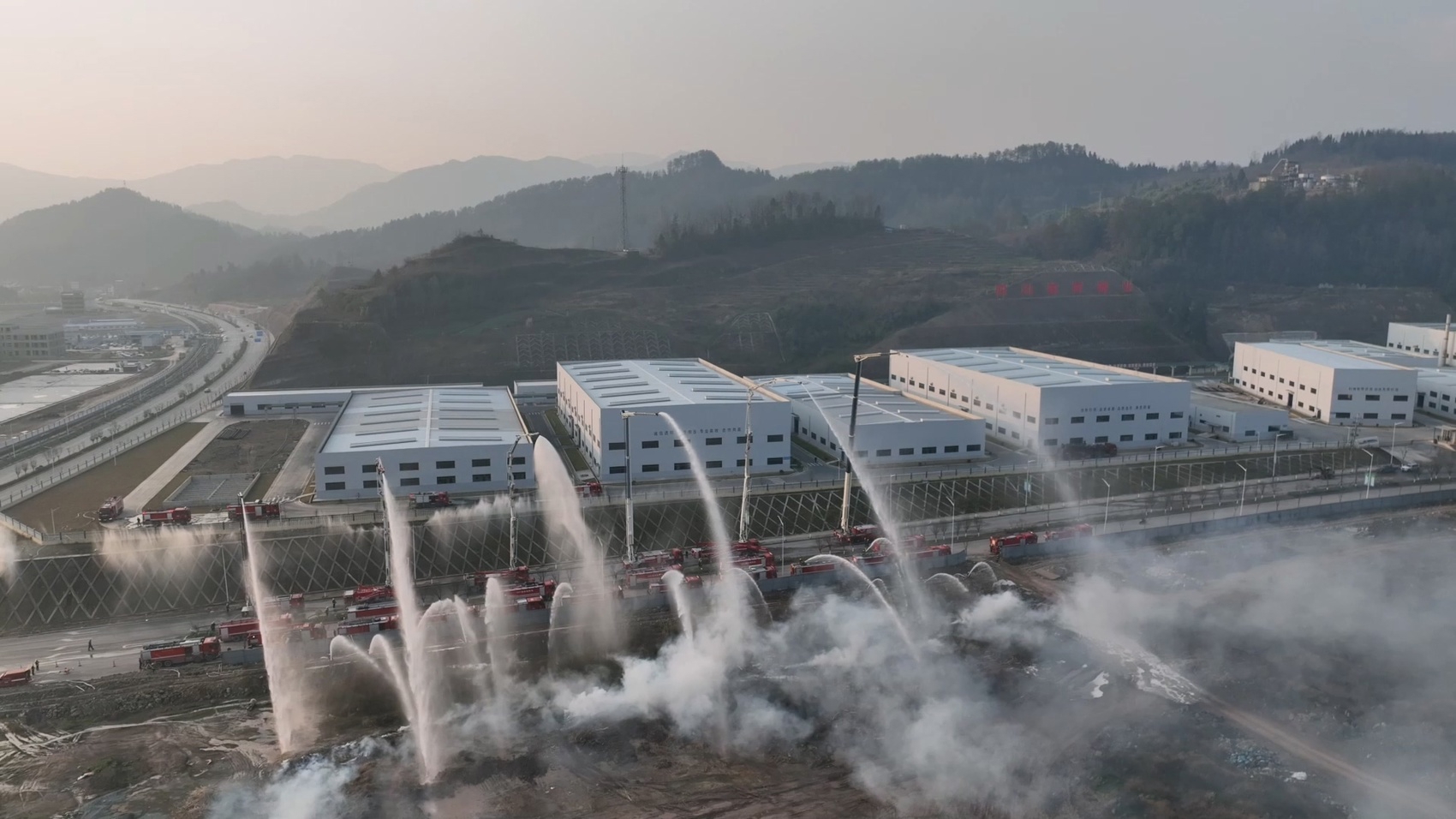演练实训了重点目标保卫科目。随着火头继续向北蔓延,火场北面一化工产业园受到威胁,四川省消防救援总队部署4辆举高消防车铺设水幕水带,架设屏风水枪,构建了一条长约200米的“水墙”,实现防火分隔、降低热辐射效果。