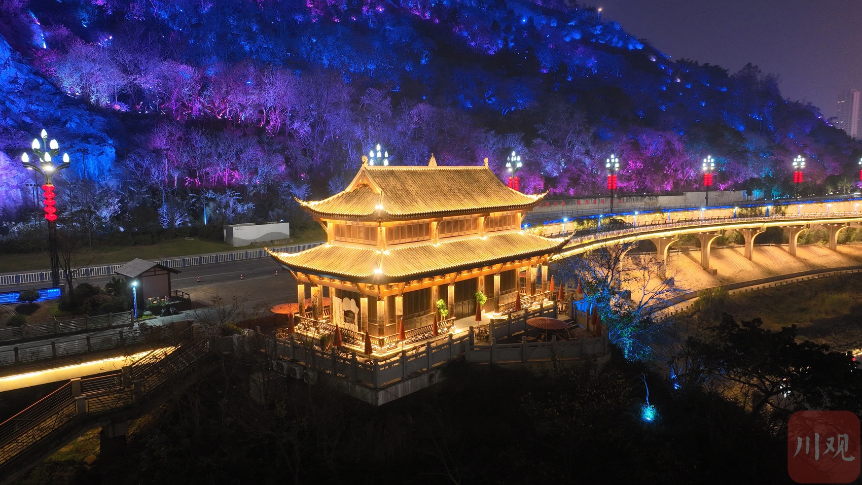 在宜宾白塔山下,复建古建筑二郎阁与僰道历史文化旅游休闲街区隔着岷江遥遥相望。这里成为了宜宾又一个休闲娱乐的临江景点。