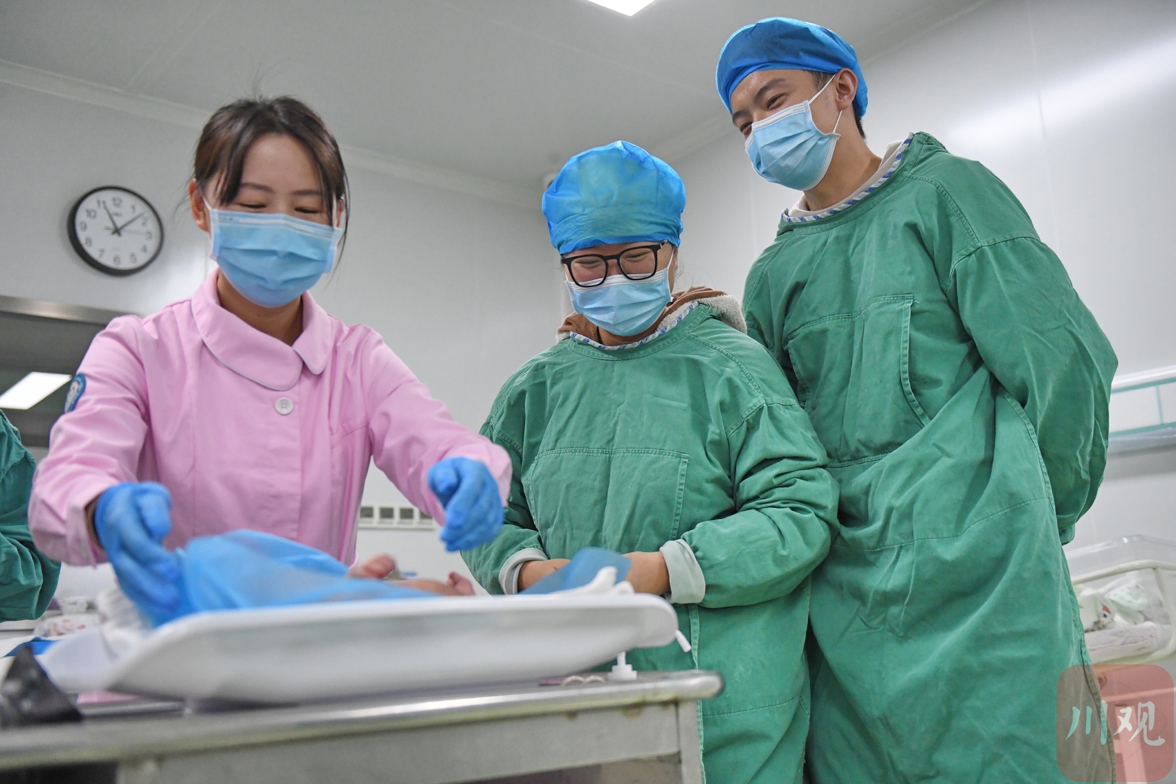 2024年1月16日,在四川省妇幼保健院天府院区母子病房正式投入运行。图为医务人员(左一)为婴儿称重量。