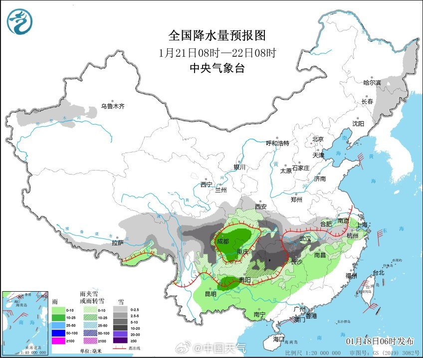 首先,中央气象台1月18日16时的预报是这样:预计1月20日至23日,我国将遭遇2024年首场寒潮天气过程,中东部地区将出现剧烈降温和大风天气;气温0℃线将南压至华南北部;伴随着强降温,21日至22日,贵州、湖南、江西等地将出现雨雪冰冻天气,降雪量级可达大到暴雪,局地大暴雪。
