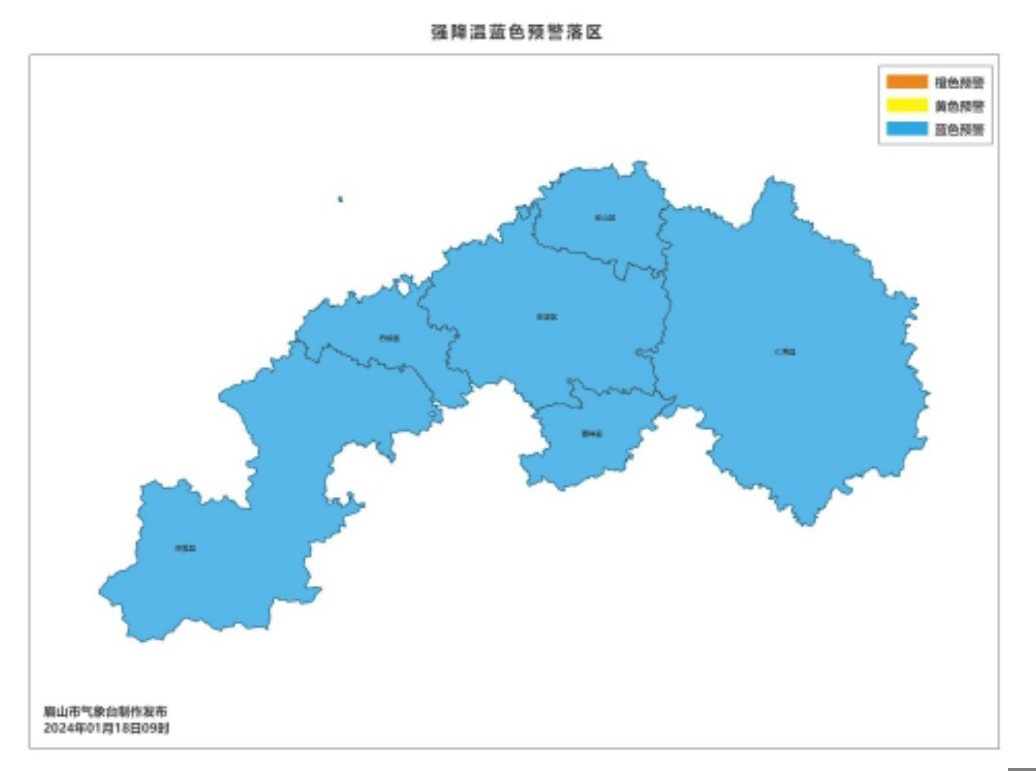 ★ 眉山市气象台2024年01月18日10时00分发布强降温蓝色预警:受地面强冷空气影响,预计20—22日我市将有一次明显的降温降雨天气过程,日平均气温累计下降6—8℃,23—25日受冷空气持续影响气温仍然偏低,此次强降温过程最低气温将降至0℃,山区有小雪,并伴有道路结冰,冷空气影响时有3—5级偏北风,山口河谷地区可达6级以上。26—28日早晚温差大,全市大部地方易出现霜冻天气。请注意防范强降温、大风、低温雨雪和道路结冰等天气带来的不利影响。
