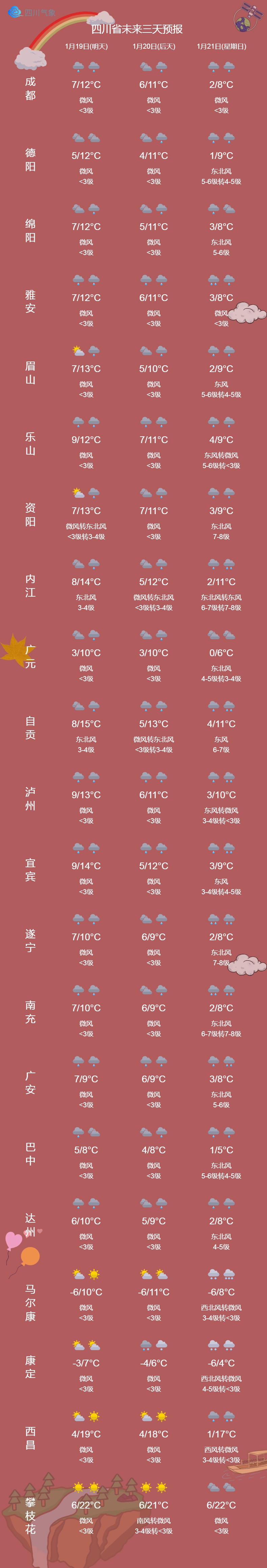根据最新气象资料分析,四川省气象台今天(1月18日)下午发布天气预报:未来三天,盆地大部阴天有小雨或零星小雨,气温将逐渐下降;川西高原多云间阴有分散阵雪(雨),攀西地区大部多云间晴,甘孜州西南部和攀西地区森林火险气象等级较高。