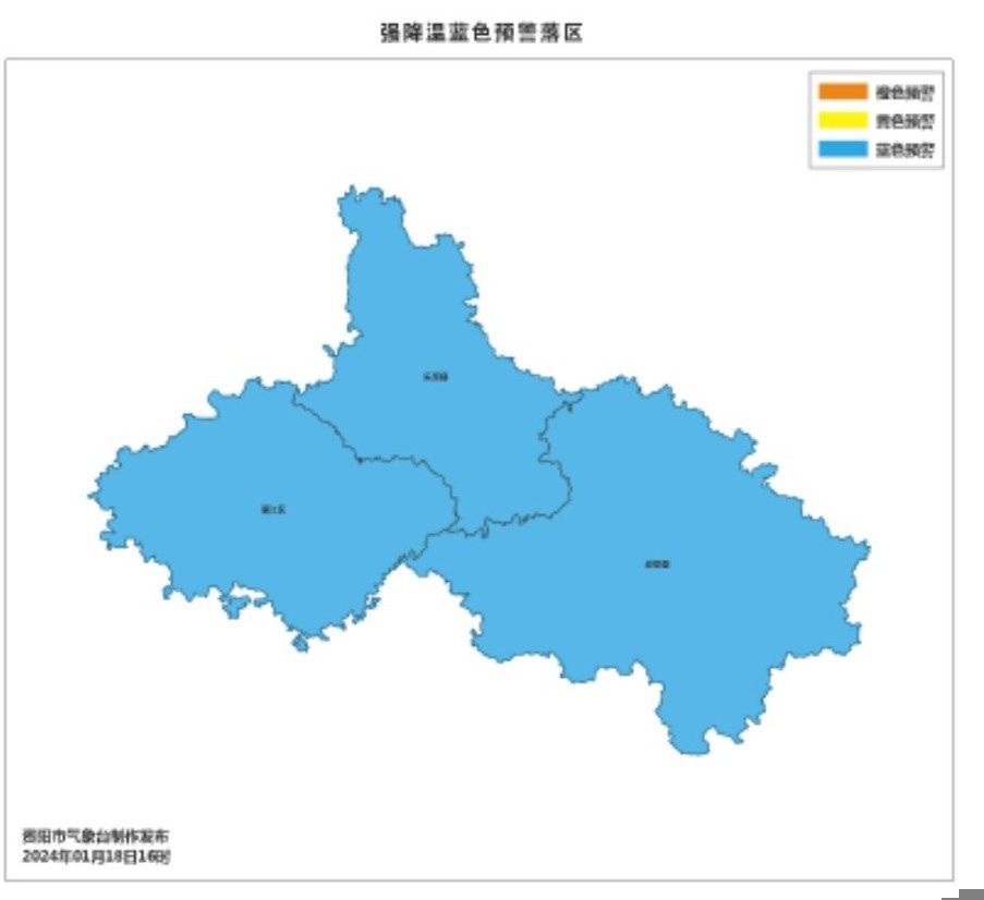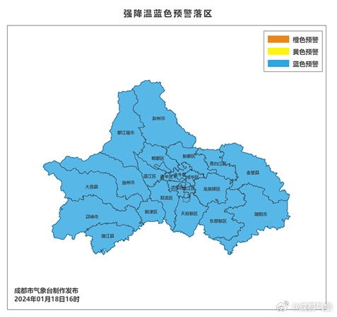 ★ 成都市气象台2024年01月18日16时00分发布强降温蓝色预警:受冷空气影响,预计20—22日我市有一次强降温天气过程,日平均气温将累计下降6℃左右,日最高气温将降至7℃左右。冷空气影响时有偏北风4—6级,东部局部地方可达7级或以上,山区有小雪和道路结冰。请注意防范强降温、大风、低温雨雪和道路结冰等天气带来的不利影响。