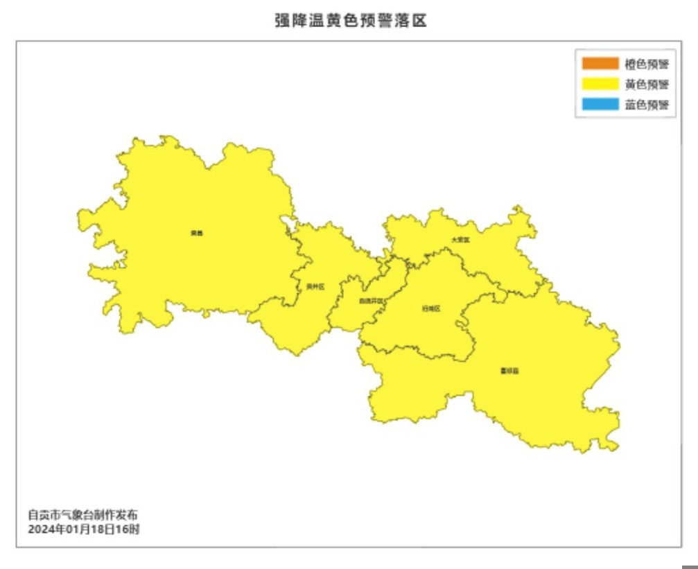 ★ 自贡市气象台2024年1月18日16时发布强降温黄色预警:受地面强冷空气影响,预计20—22日我市将有一次明显降温降雨天气过程,日平均气温将下降8℃左右,最低气温将降至3℃,西部山区将降至0℃并有小雪或雨夹雪,冷空气影响时有4—5级偏北风;23—25日气温持续偏低,将出现霜冻天气。此次过程降温幅度大、低温持续时间长,广大群众需做好防寒保暖工作,注意取暖用电、用气、用火安全。请各地注意防范此次强降温、持续低温、霜冻天气对农业、畜牧业带来的不利影响。人影部门抓住有利时机适时开展抗旱和消污人工增雨作业。