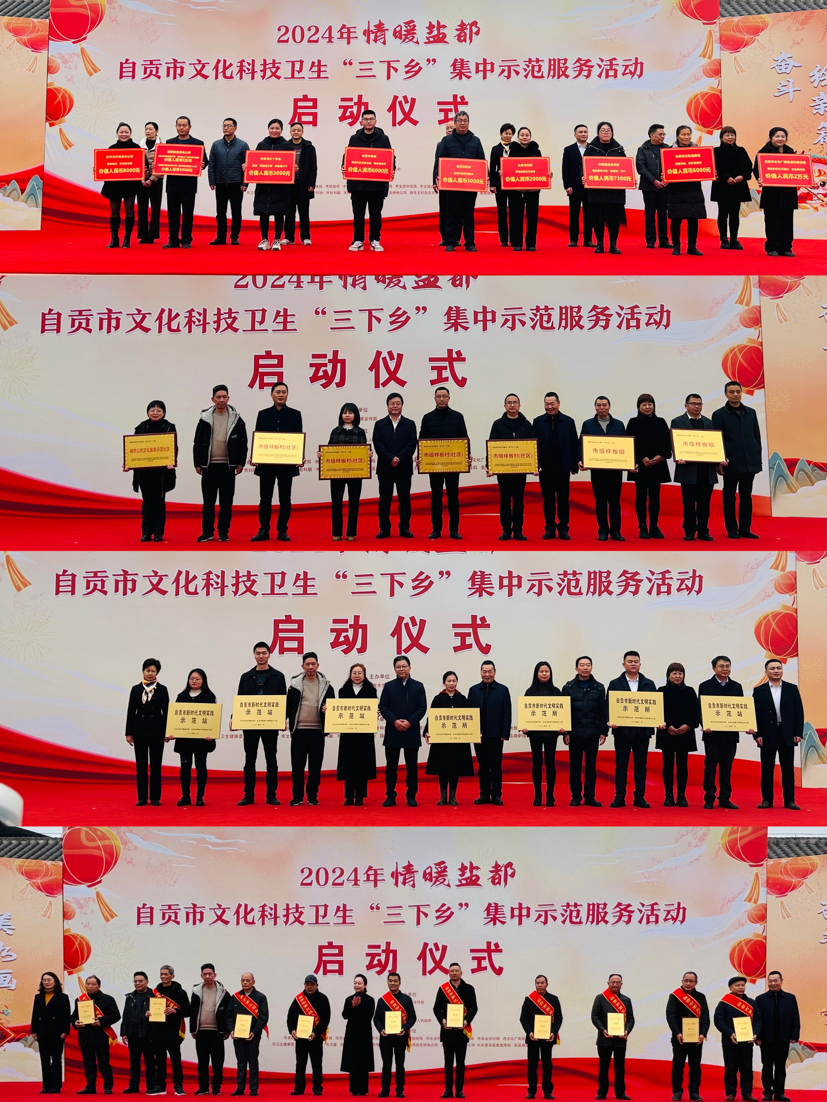 与此同时,启动仪式上还向10名自贡市第三届“盐都乡贤”获得者、7名自贡市第一批新时代文明实践示范所(站)代表、7名自贡市2023年度乡村文化振兴样板镇村及公共文化服务示范社区代表颁奖、授牌。