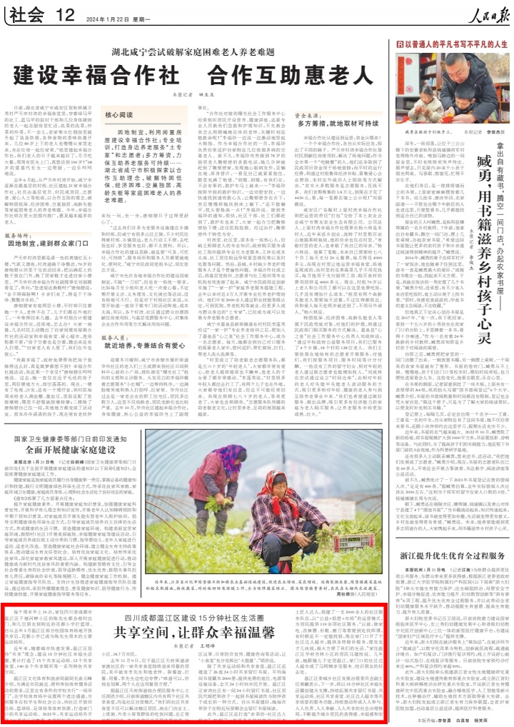 此外,温江区还打造“亲邻坊·社区达人超市”,挖掘了一批具备各种技能的社区本土匠人达人,组建了一支3000余人的社区服务队伍,以“公益+低偿+市场”的运营模式,为居民提供110余项社区服务。“以前,修家电、改裤腰、补鞋、磨刀等需要到处找师傅,有时候还不一定能找到,现在家门口开了个社区达人超市,提供各样修补服务,理发也才几块钱,极大方便了我们的生活。”家住温江区学府杏林小区的居民马建枝说。几年前,她跟随儿子定居温江,家门口的社区达人超市成了马阿姨享受服务、结识朋友的好去处。