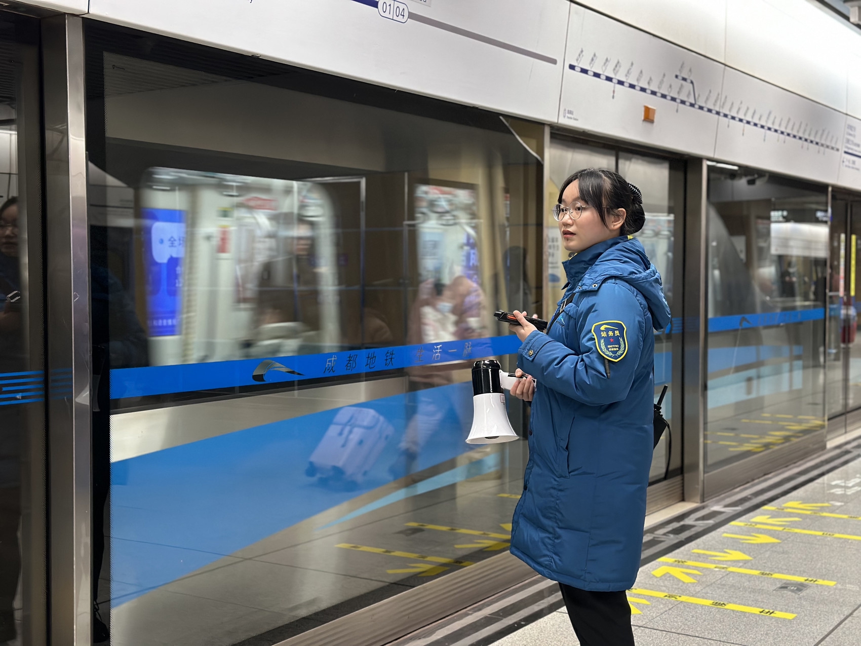 在临近车厢巡检中的跟车保安黄青是爱心接力的第二棒。他得知消息后,第一时间跑到婴儿车前,紧紧拽住婴儿车把手,并立刻联系文殊院车控室——“下行13号门有个婴儿车需要接!”9点37分,文殊院站车控室立即通知站台岗。爱心接力的第三棒站务员袁慧在13号门外等候接应。