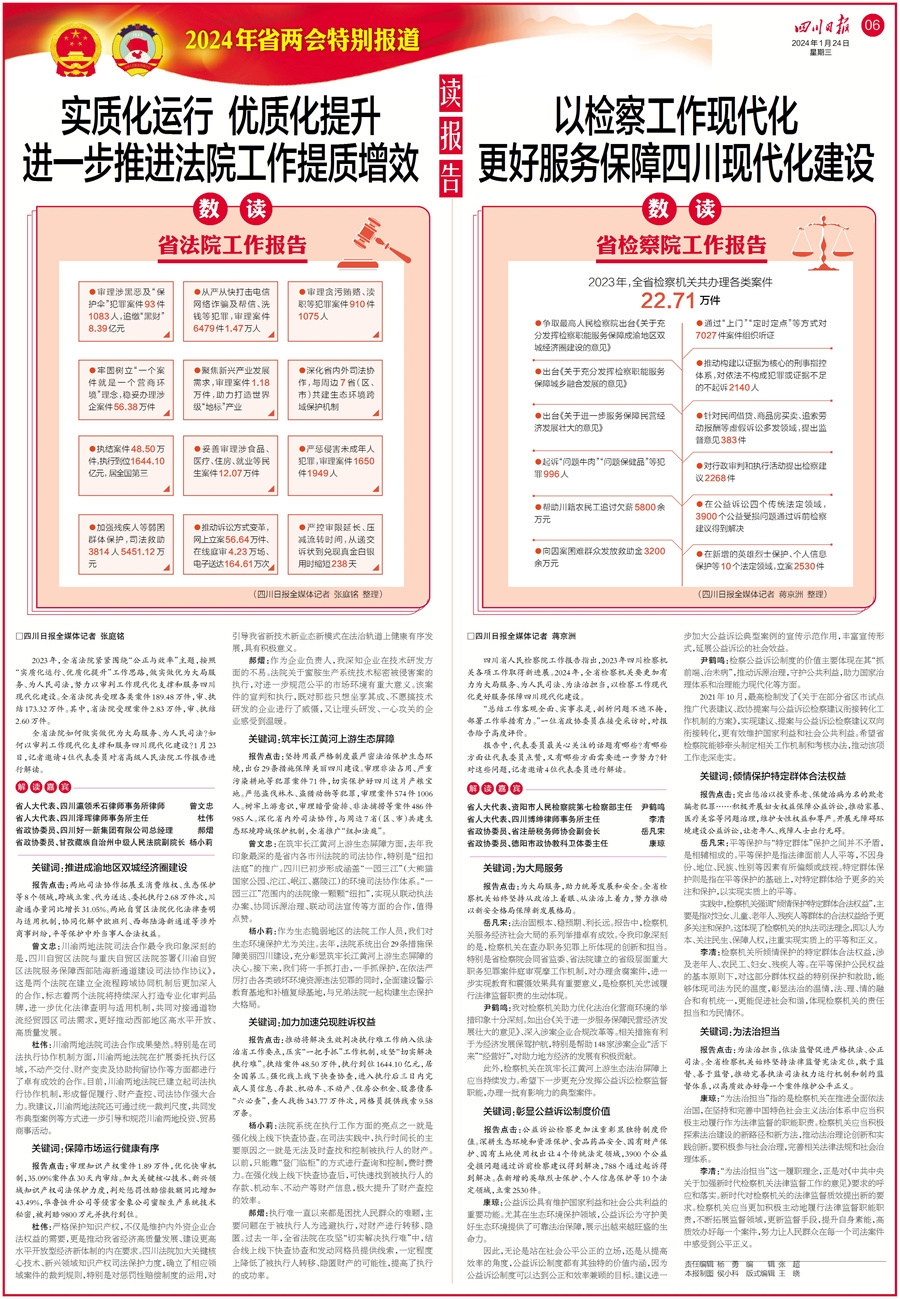 继续关注省两会。今日我们一起数读2023年两院工作报告。“审理涉黑恶及‘保护伞’犯罪案件93件1083人,追缴‘黑财’8.39亿元”“帮助川籍农民工追讨欠薪5800余万元”, 更多数据,看今日六版。