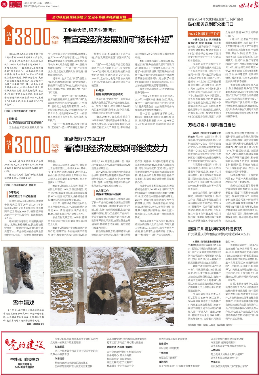 2023年各地经济数据陆续出炉,宜宾、德阳表现亮眼。其中,德阳地区生产总值迈过3000亿元大关。至此,全省已有4个GDP站上3000亿元台阶的市州。 宜宾不仅动力电池增长强劲,而且服务业总量及增速均位列全省第一方阵。2024年,两市还有什么新谋划,今日八版有答案。