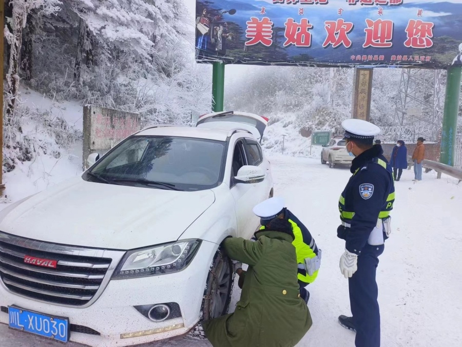 其中,在X149线黑竹沟至美姑段,峨边县公安局交警大队黑竹沟中队长廖邦奇带领队民辅警及时清除落石、树枝等路障,主动为过往车辆捆绑防滑铁链,积极救助被困群众和车辆,全力护航交通安全。同时,该中队在乐山峨边至美姑最艰苦最寒冷的椅子垭口路段,设置临时执勤点,逐车检查、逐人提醒,确保人民群众出行安全。
