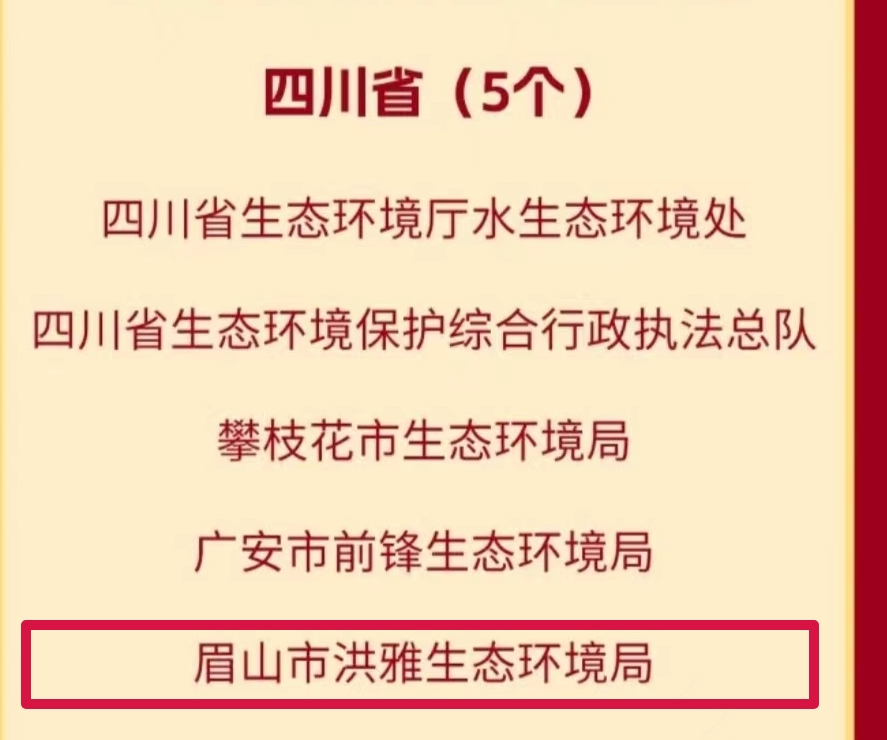 1月24日,全国生态环境系统先进集体和先进工作者表彰大会召开。会上,人力资源社会保障部、生态环境部对117个先进集体和45名先进工作者予以表彰。其中,眉山市洪雅生态环境局在列。