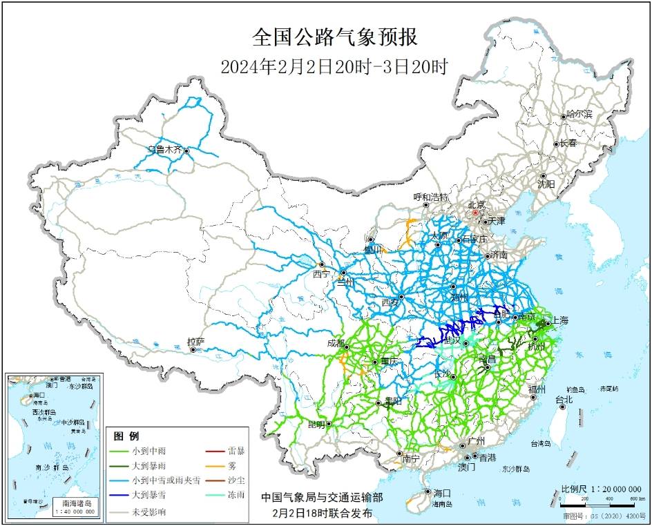 受天气影响,据中国气象局与交通运输部2024年2月2日联合发布的全国主要公路气象预报:2月2日20时至3日20时,广东西部、广西南部、重庆西部、四川东南部、贵州中部、甘肃南部、青海东部、陕西北部、宁夏东部、内蒙古南部等地局地有雾。川藏铁路配套工程公路的部分路段受小到中雪或雨夹雪影响,需防范对施工建设和物资运输的不利影响。