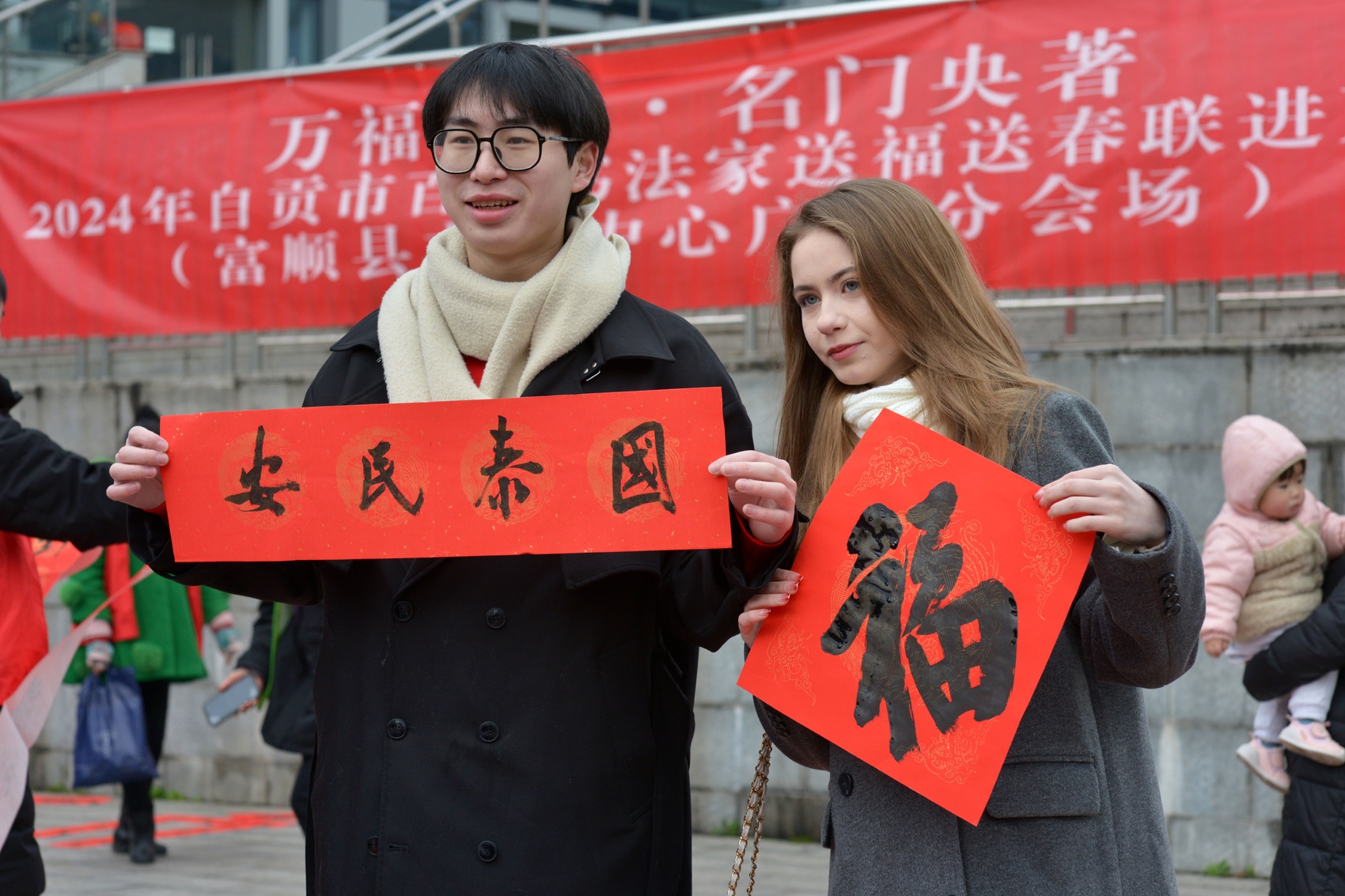 主会场人气爆棚,各区县分会场也热闹非凡。在各乡镇现场,赶集群众纷纷向书法家们介绍自己家里的情况,请求书写符合自己家里情况的寓意美好的春联,在富顺县文体中心活动现场,来自俄罗斯的女青年卡佳跟着自己的男朋友富顺小伙儿陈煜来到书法家面前,拿到充满春联和福字后,兴高采烈地拍下照片发给自己的家人,分享中华传统文化营造出的独特新春欢乐氛围。还有些正在学习书法的小朋友更是摩拳擦掌跃跃欲试,拿过老师们的毛笔,写下一副副稚嫩的春联。