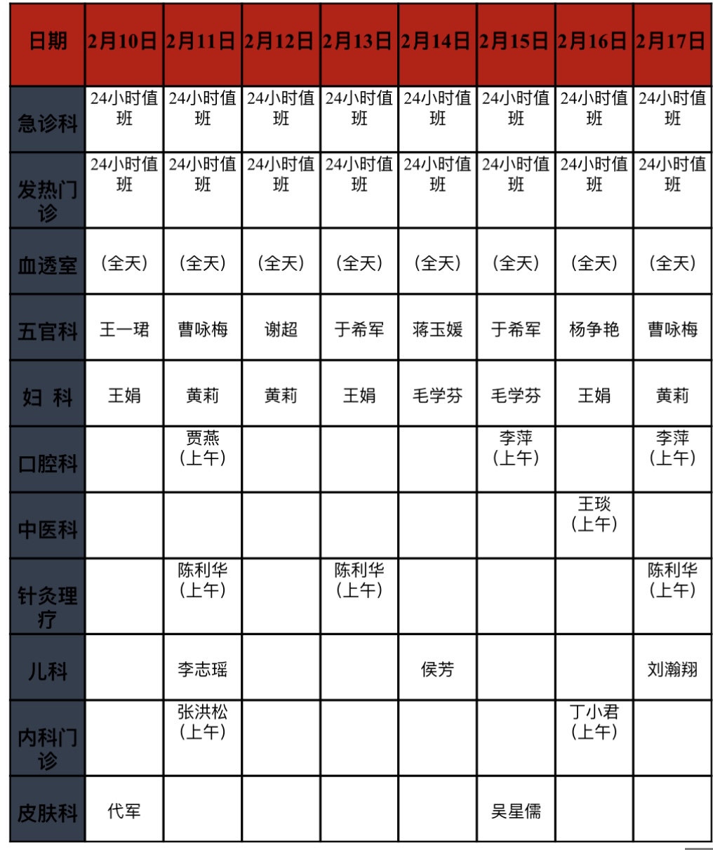 ·特殊门诊值班时间:2月11日8:00—12:00、2月14日8:00—12:00
