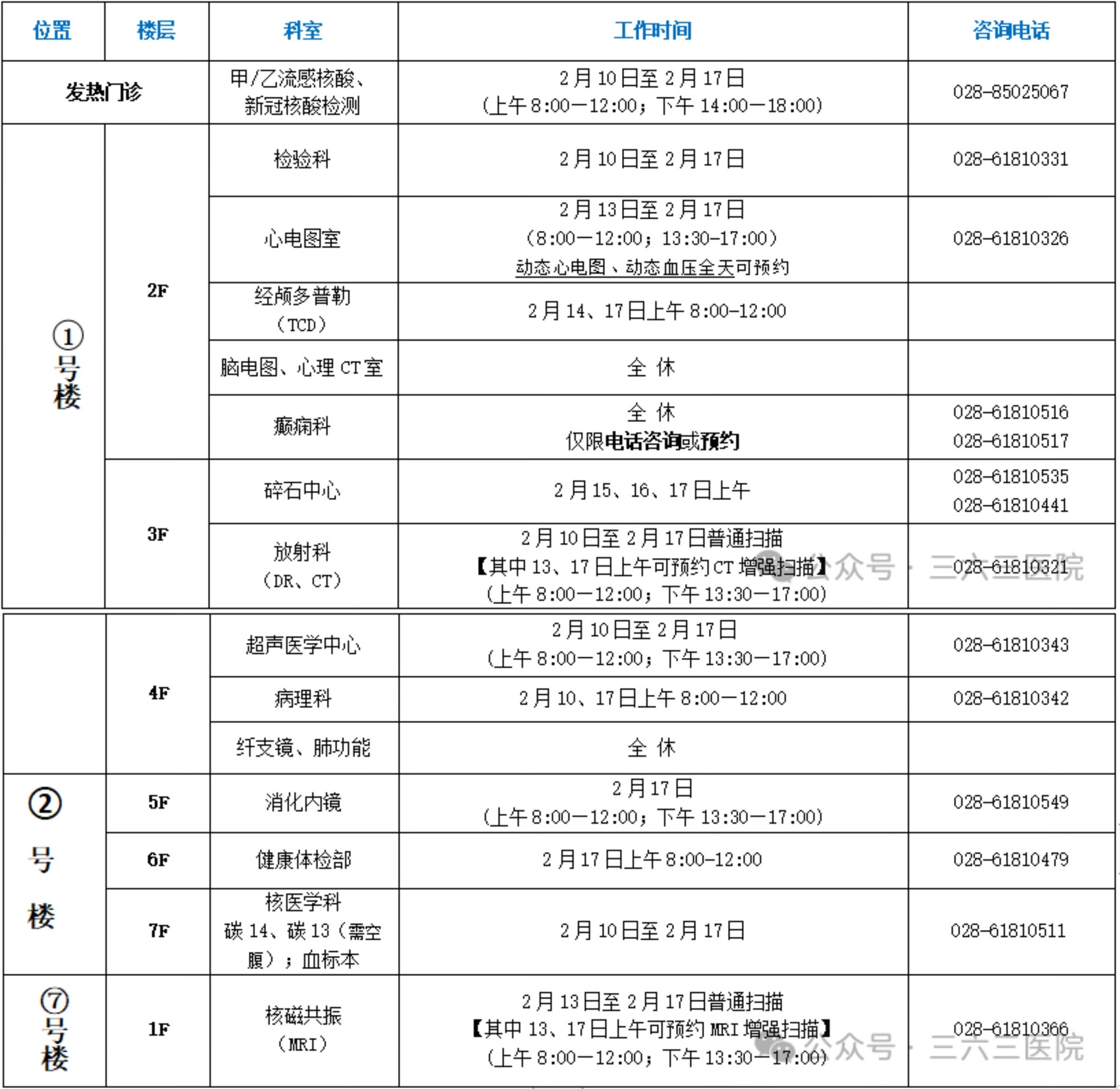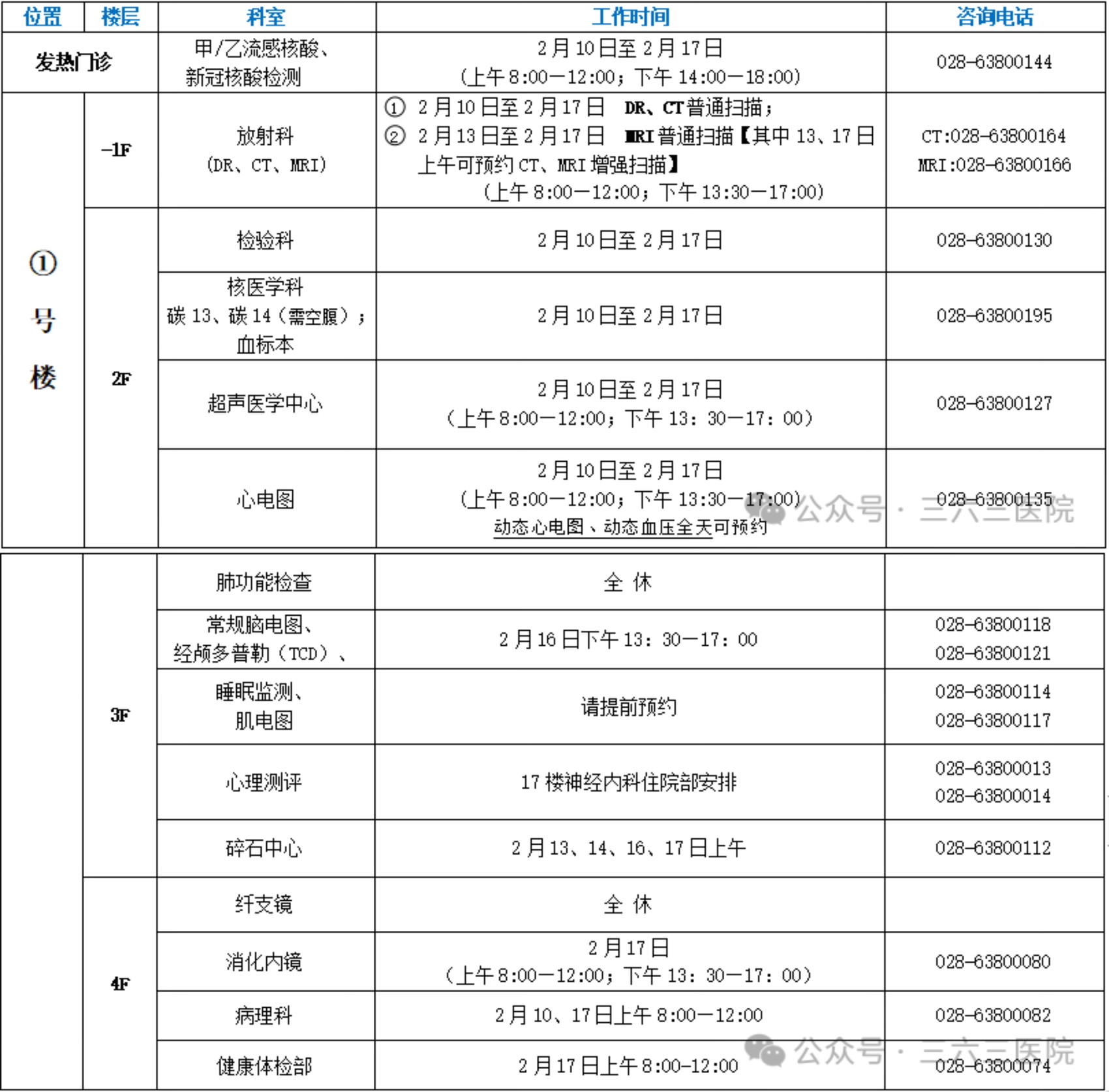 超声医学科、放射科、检验科、心电图室:2月10日—2月17日正常开放,增强CT和磁共振检查均需预约检查。