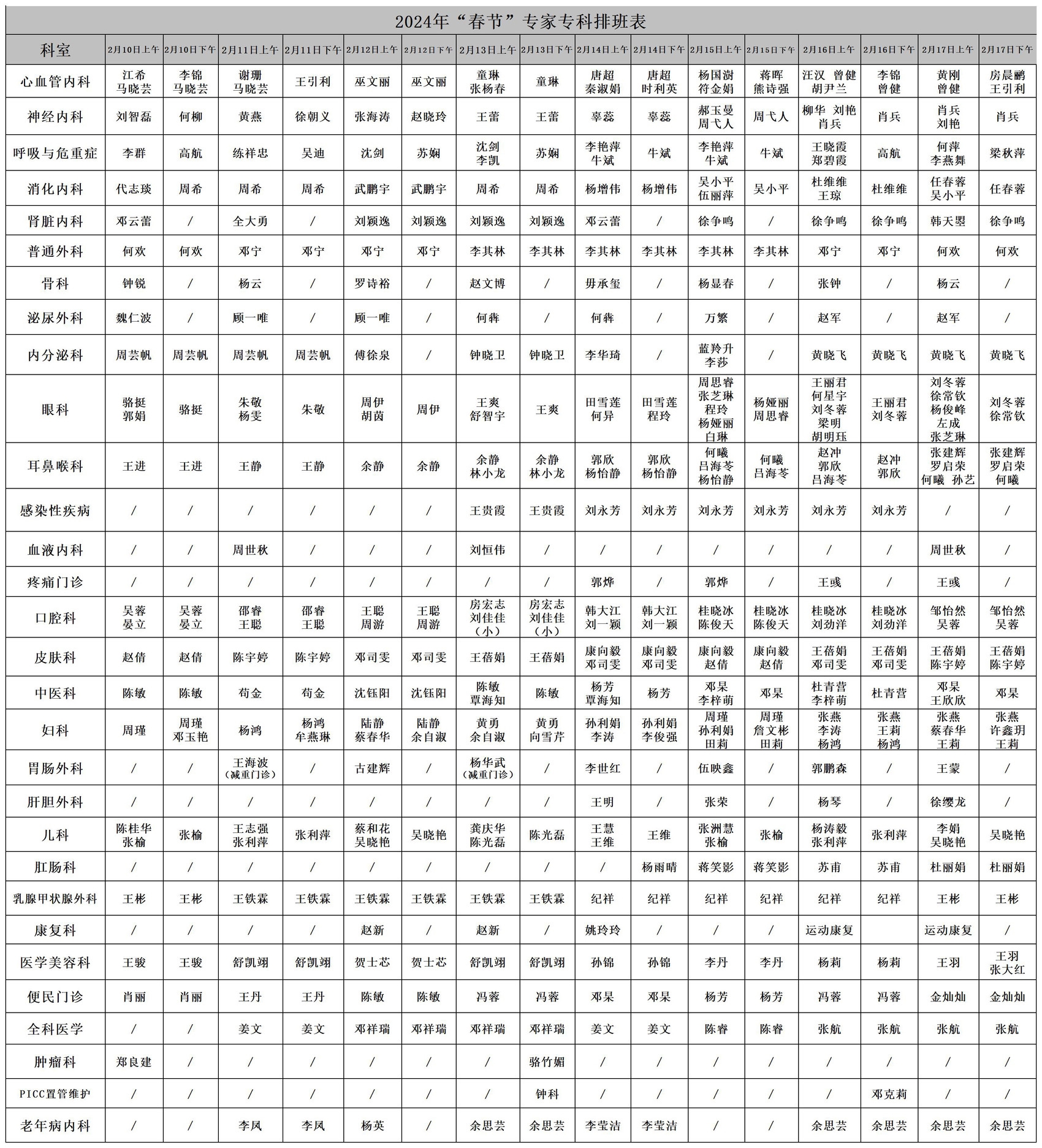 “春节”门诊安排如下: